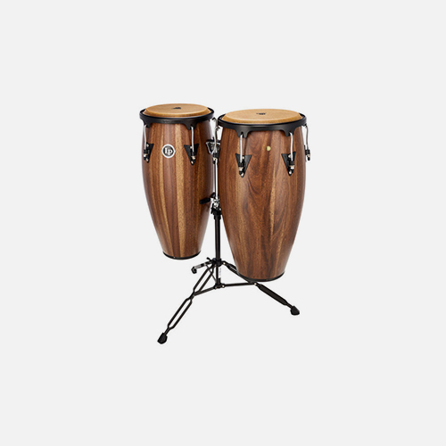 Série Aspire Diâmetros: 11" e 12" Material da carcaça do tambor: madeira de nogueira tailandesa 15% mais leve que o carvalho siamês Cabeças de tambor natural Hardware preto fosco Suporte de conga duplo preto incluído