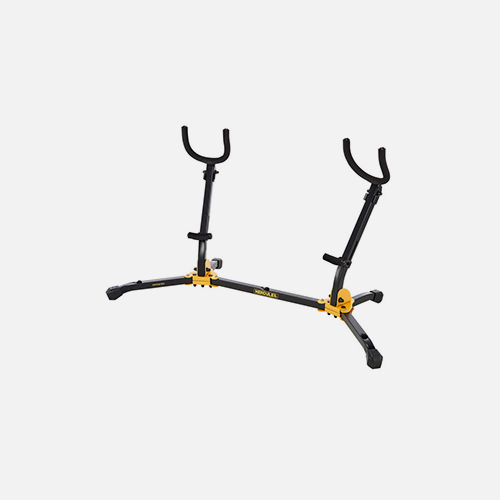 Suporte duplo com apoios superiores dobráveis. Apoios centrais acomodam tanto saxofones alto como tenor. Design de uma só peça que se dobra de forma compacta. Pernas articuladas. Possibilidade de extensão de três hastes para instrumentos extra sem ocupar mais espaço.