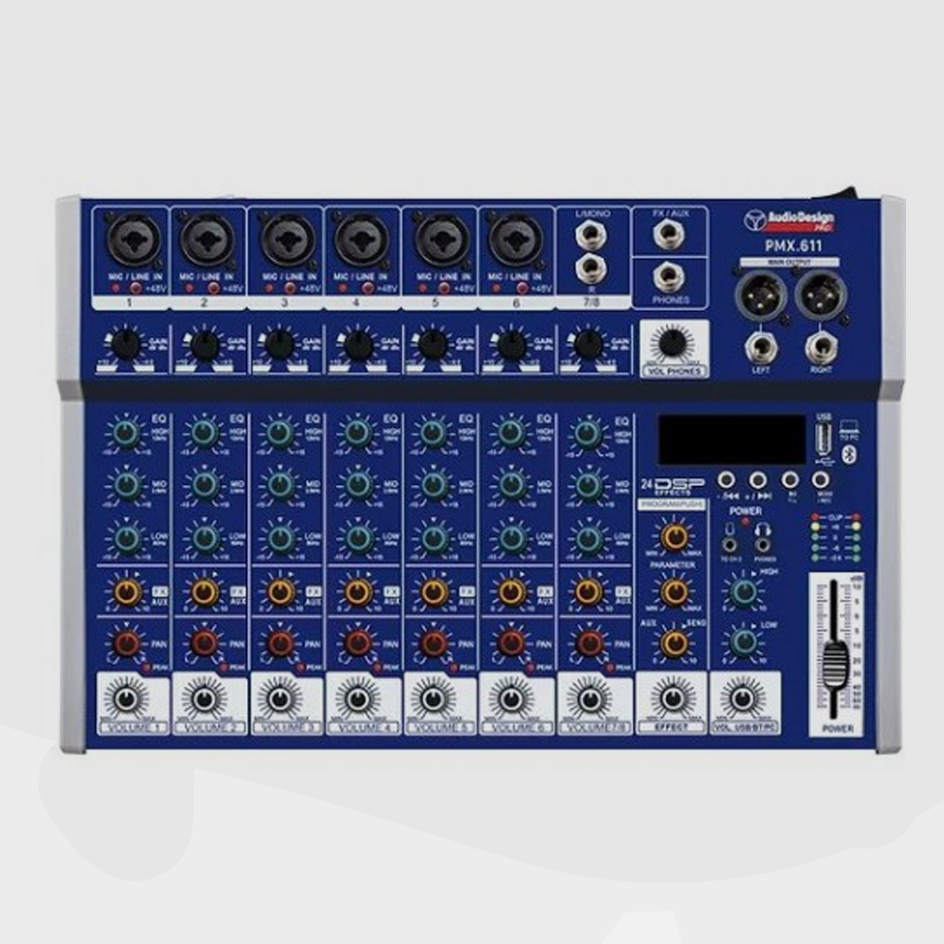 6 Mono - 1 canal estéreo - 1 canal USB / BT / PC - 16 efeitos com DSP Uma série compacta com desempenho e efeitos de alto nível, perfeita para viver e versátil para qualquer uso. A função da placa de som permite o uso interativo (IN - OUT) com um PC