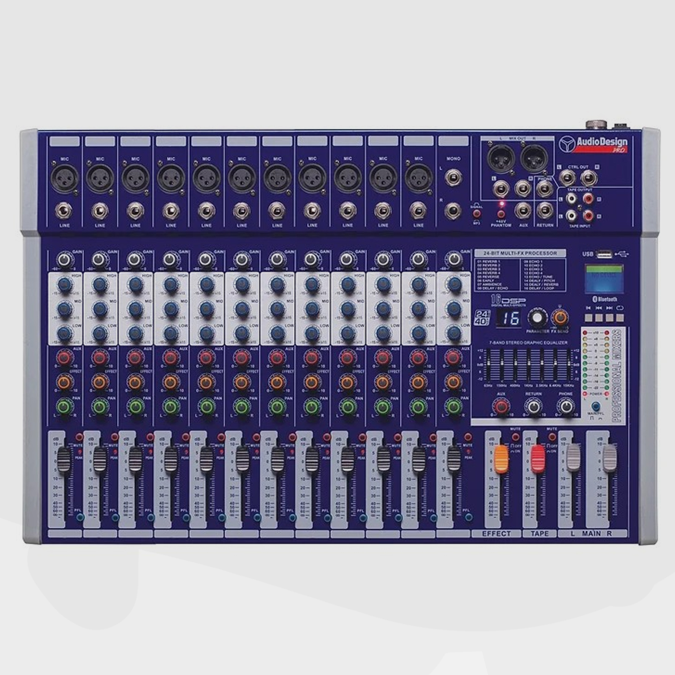 Mesa de mistura com 12 canais (11 mono + 1 stereo). Equalizador 7 bandas. 3 Bandas de EQ por canal. Controlo de efeitos por canal e controlo de efeitos no main. 16 Efeitos DSP, incluíndo 4 de reverb. Phantom power: 48V. Alimentação externa de 220V.