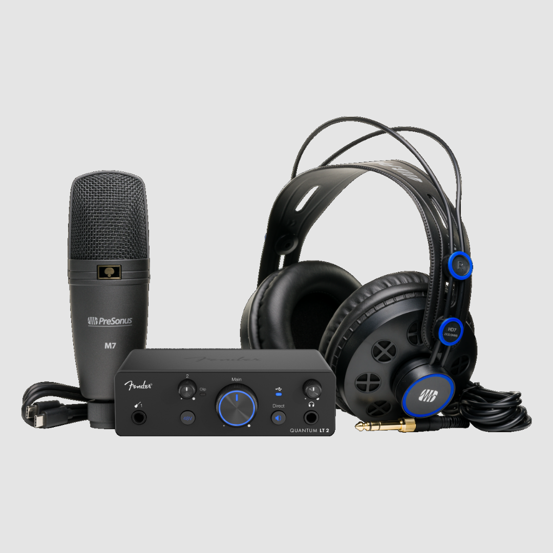 Com o pacote Fender Quantum Creator, é muito fácil gravar a sua criatividade, esteja em casa ou fora. A sua peça principal é o Fender Quantum LT 2. Este pacote fornece tudo o que precisa para gravar vozes, instrumentos e podcasts com qualidade profissional, incluindo um microfone condensador de diafragma grande M7, auscultadores profissionais HD7, cabo de microfone e um suporte de mesa.