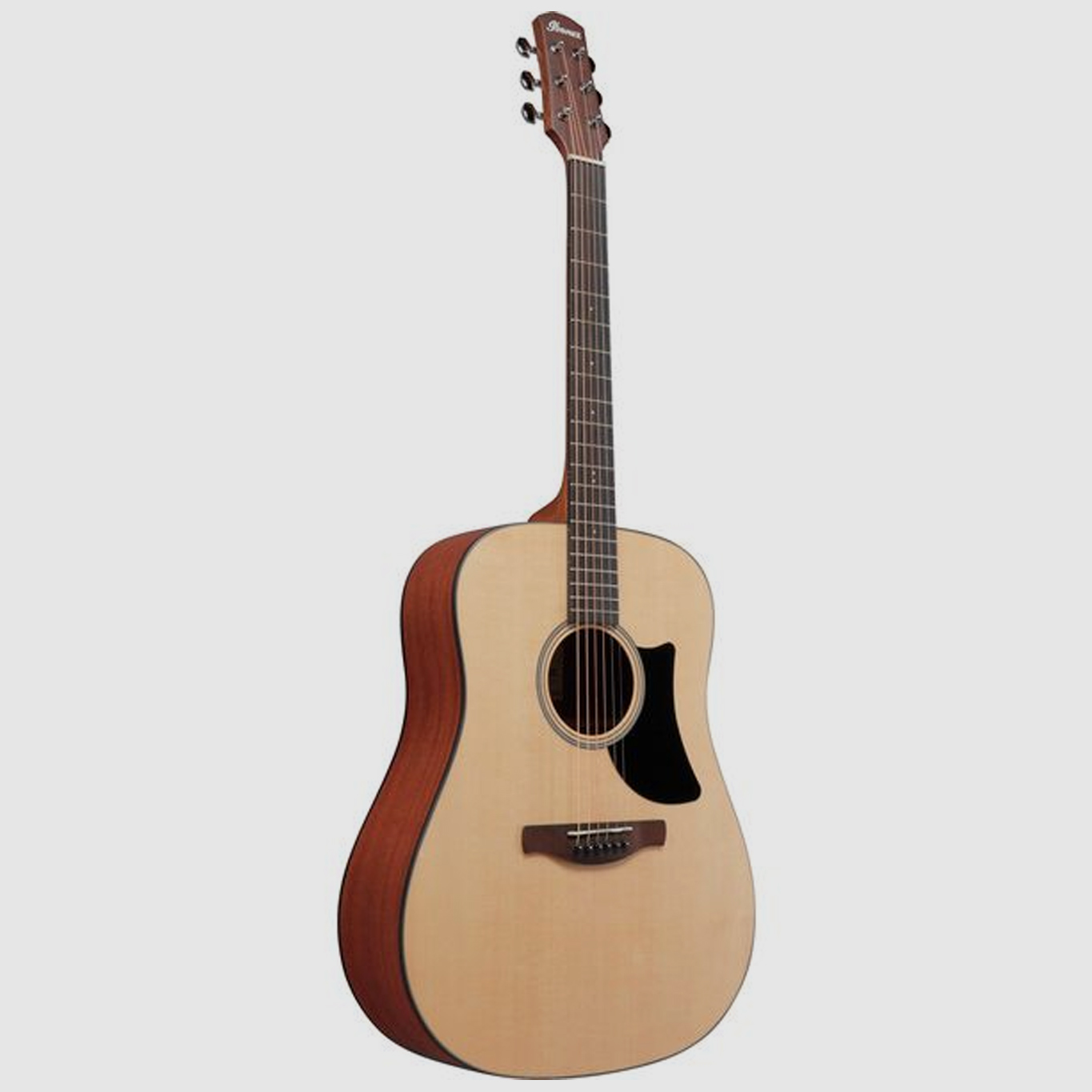 Ibanez AAD50-LG; guitarra acústica grande dreadnought; reforço x-m; série de anúncios; costas e lados: sapele; tampo: abeto maciço; pescoço: okoume; escala: coração roxo; embutidos: pontos brancos; 20 trastes; porca: plástico; largura da porca: 43 mm (1,69"); escala: 650 mm (25,6"); material da ponte: roxo; sela: plástico; sintonizadores: fundidos; cor: natural; cadeias de ações: 0,012 - 0,053