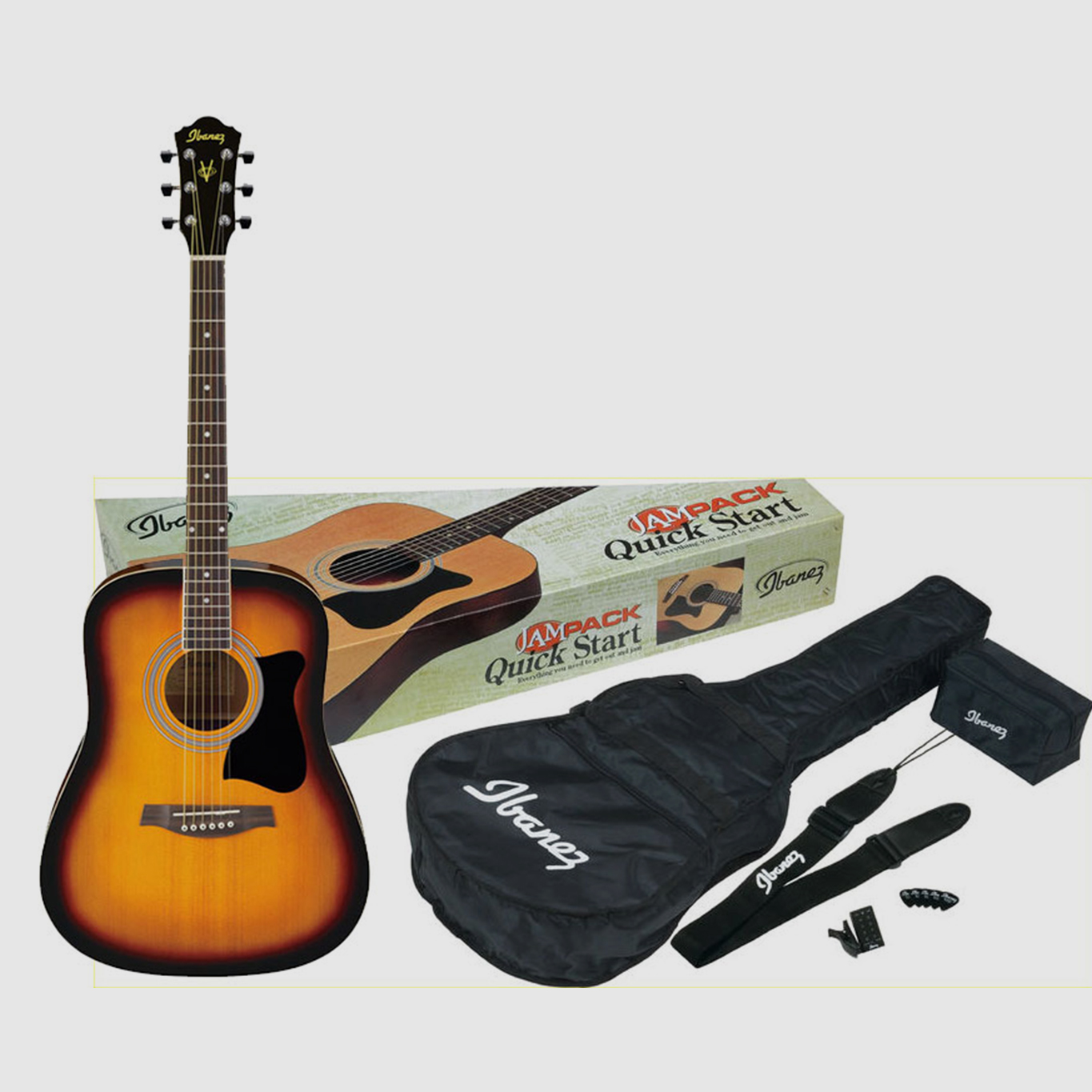 Conjunto inicial completo Guitarra V50 em aço com parte superior em abeto Corpo: Agathis Fretboard de pinho tratado da Nova Zelândia Embutimentos de ponto pérola Cabeças de máquina fechadas Cor: Sunburst Incl. Afinador, bolsa de transporte, alça, palheta e bolsa de acessórios