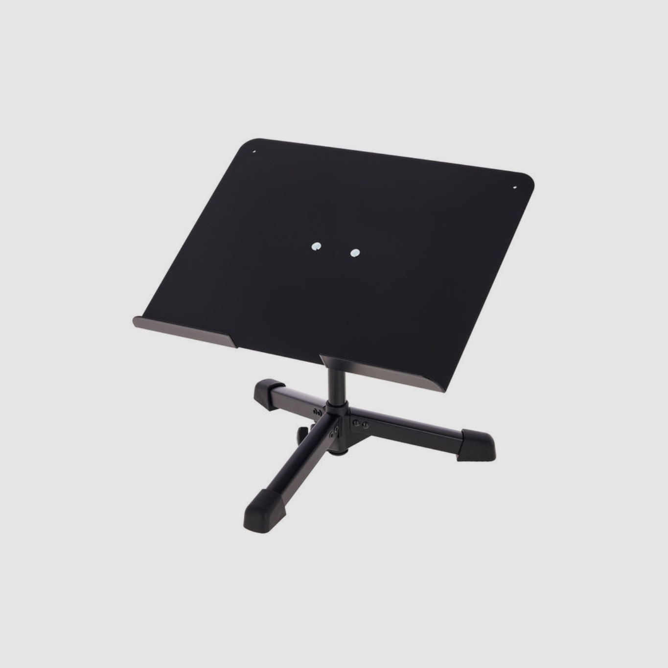 Suporte de mesa dobrável com 3 pés Adequado para laptops e equipamentos multimídia, também adequado para manuscritos, notas de aula, partituras, etc. A mesa continuamente inclinável é simplesmente conectada com um conector em forma de prisma à base Carga máxima: 4,0 kg Secretária: 350 x 273 mm Altura. 240 mm Peso: 1,3 kg