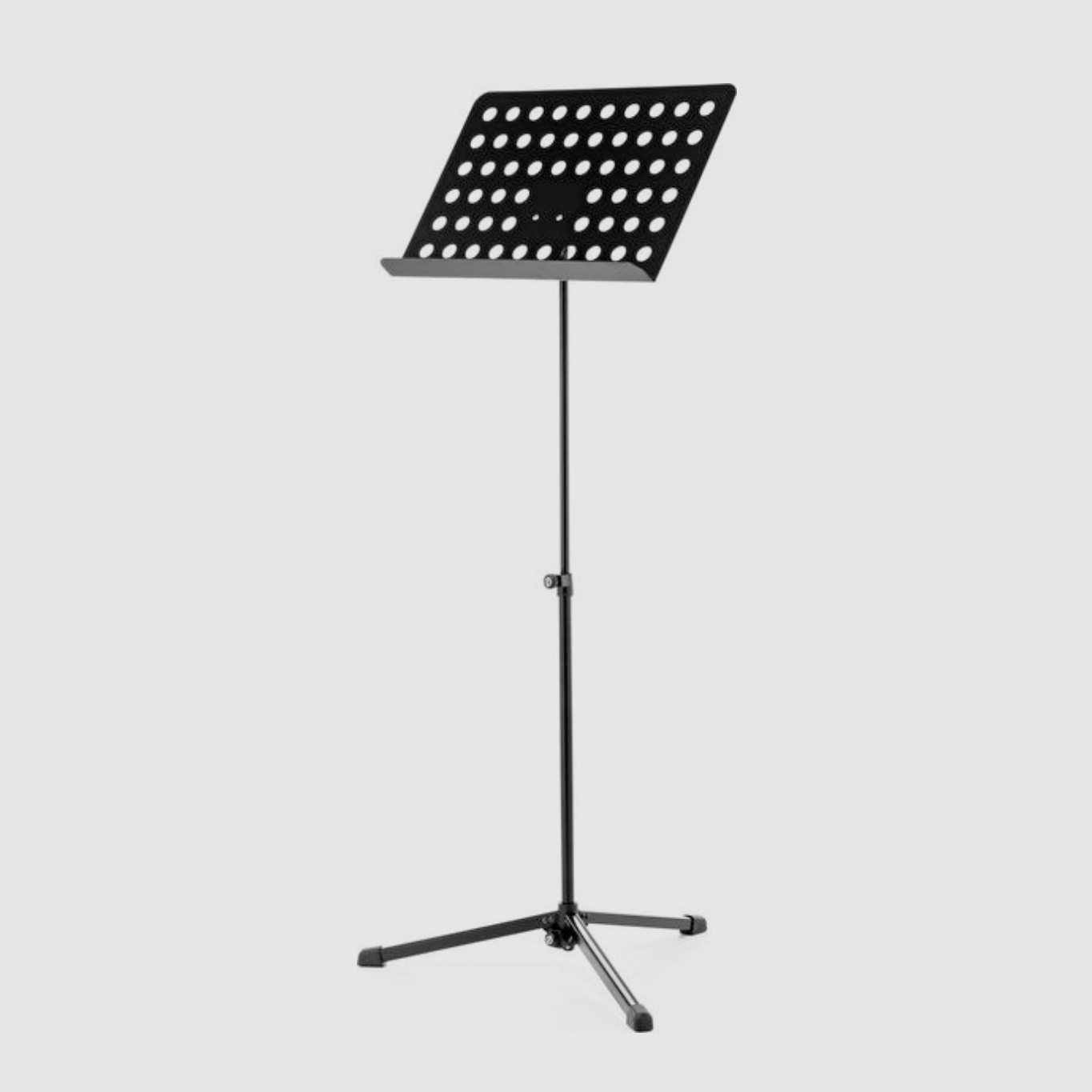 Suporte de partituras perfurado Altura do suporte 610 - 1.080 mm Porta-folhas: 500 x 340 mm Altura total combinada máxima 1.320 mm Suporte de chapa de travamento rápido, que é preso com 2 parafusos de travamento Base de encaixe com pés de borracha O mecanismo de travamento na base trava as pernas firmemente Uma peça pode ser estendida