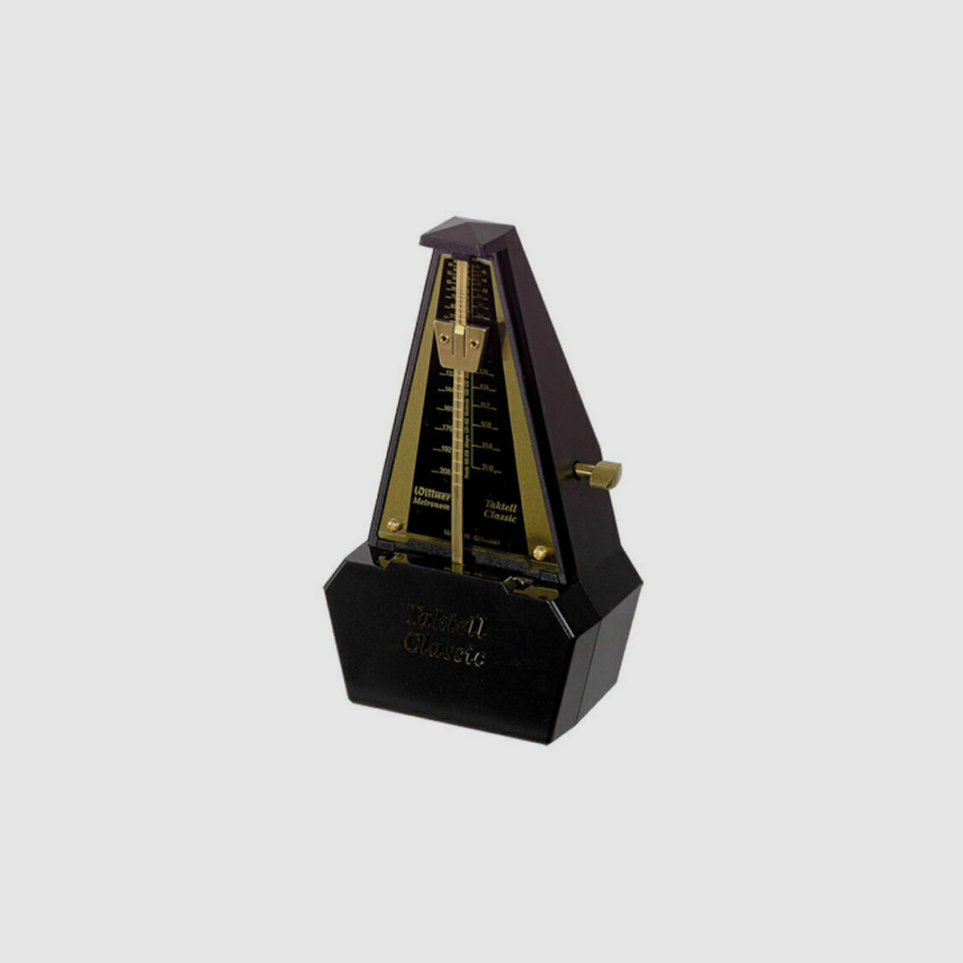 Metrónomo Wittner modelo clássico preto/dourado, depois de dar corda e colocar a funcionar, a corda dura bastante tempo e é muito fiável, marca o tempo visualmente, e de forma bem audível Não necessita de pilhas, usa um mecanismo de corda acionado por uma chave que pode ficar no espaço interno quando o metrónomo não está a ser usado