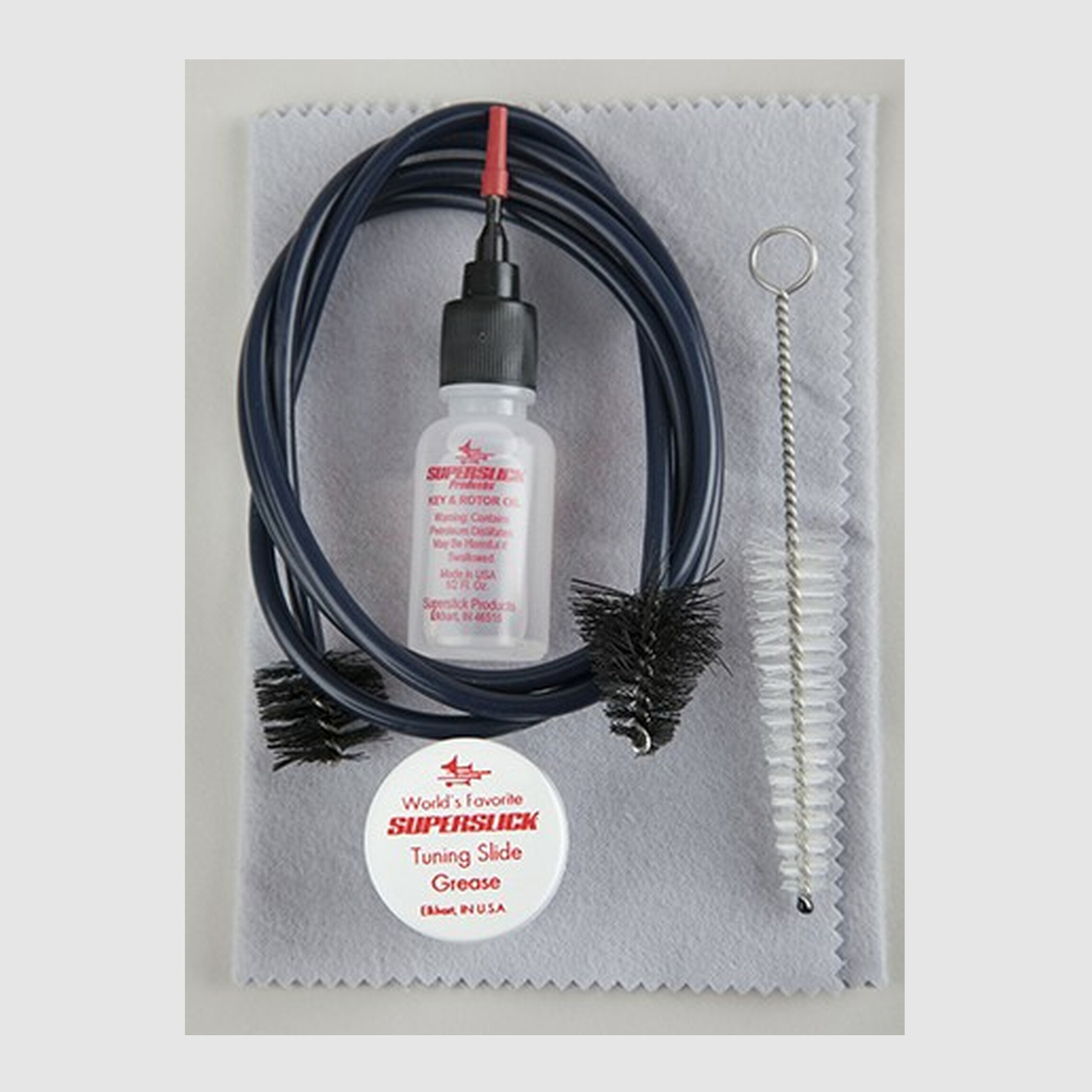 Inclui óleo de rotor Superslick, graxa para slides de ajuste, escova de limpeza flexível revestida de vinil, escova de bocal, pano de polimento