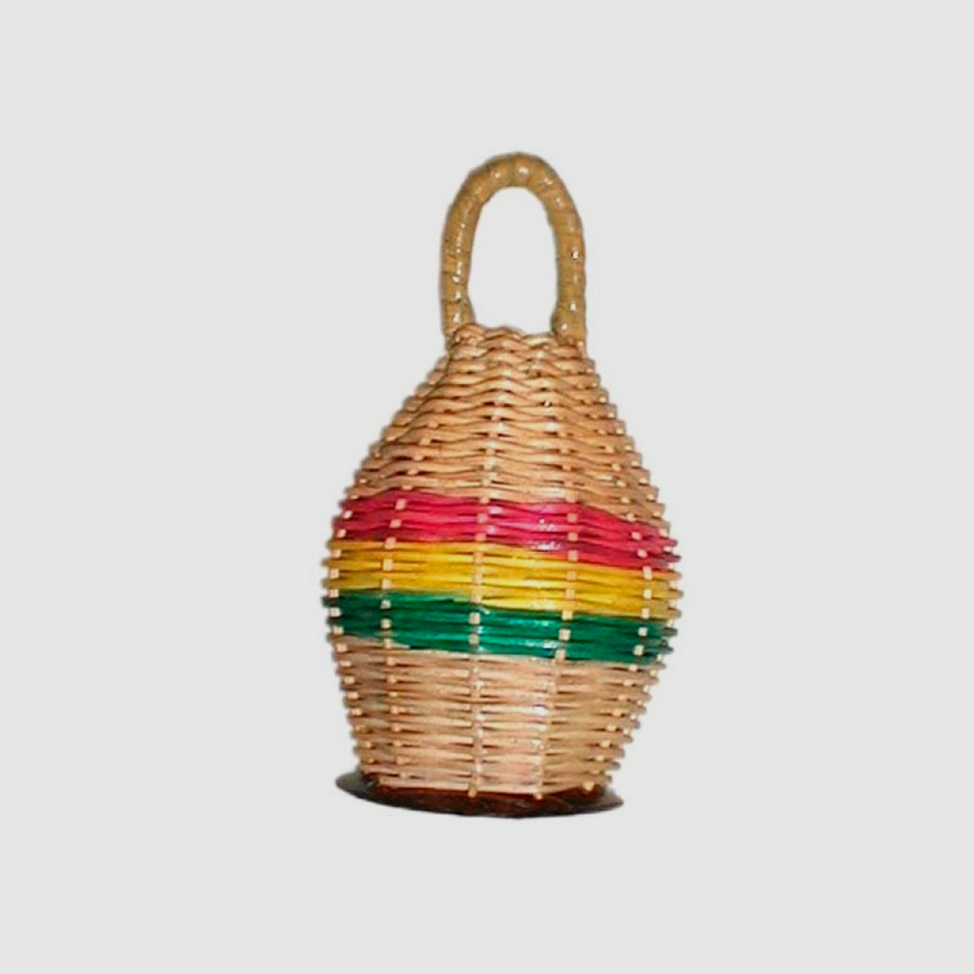 Caxixi em vime. Altura 15 cm. Estes pequenos cestos com contas em plástico no interior, são originários de África. A sonoridade varia entre um som seco e o som de um shaker se as contas interiores ficarem a vibrar no fundo.
