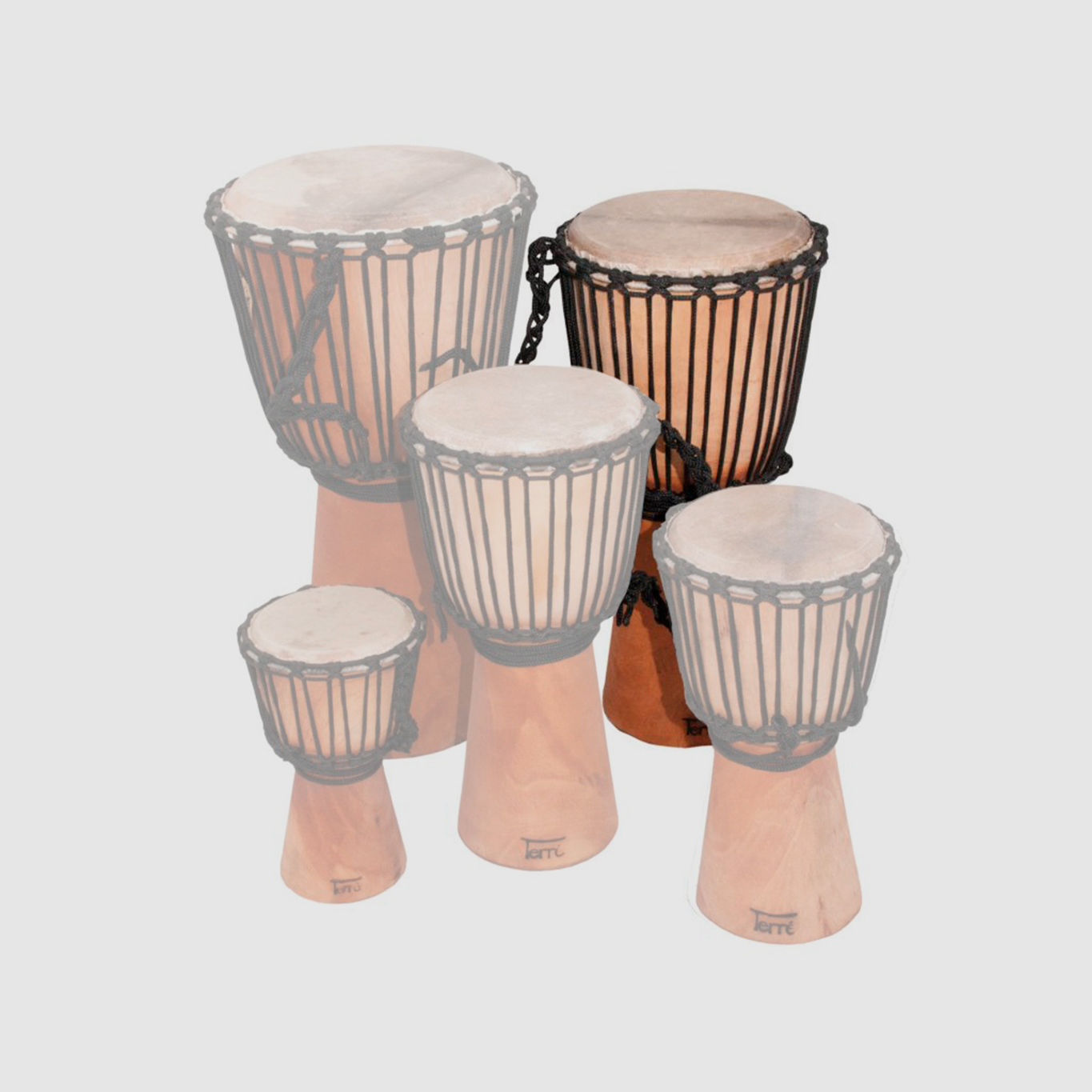 Djembé, 60cm de altura. Feito de uma peça única de madeira mahogany, com acabamento liso, tratada com óleo para resistir ao uso diário. Cabeça em pele natural de cabra (Ø 26-29cm).