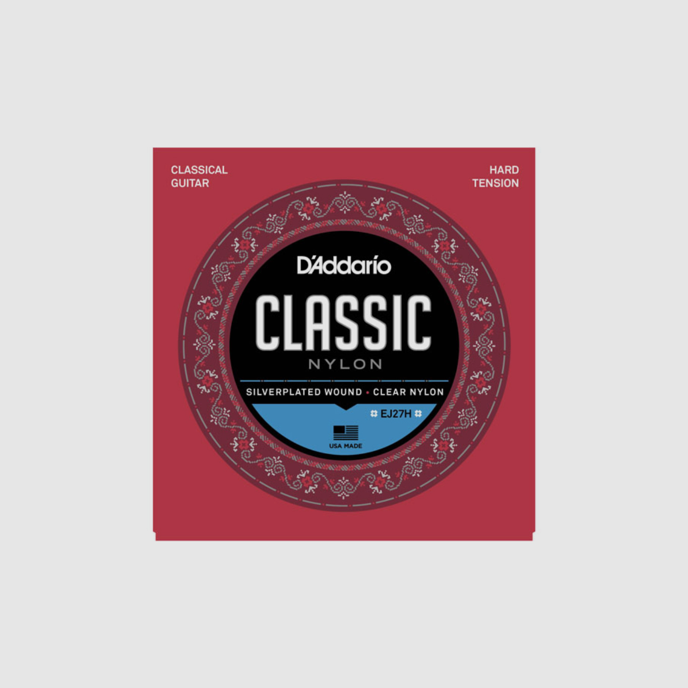 As cordas de guitarra EJ27H Classic Nylon da D'Addario de tensão forte contém 3 agulhas de nylon transparente e 3 metais ferrosos de cobre banhados a prata para o equilíbrio ideal de tons quentes e projectados de longa duração. Este conjunto de tensão forte também está disponível para guitarras clássicas fracionadas de 1/2 e 3/4 de tamanho.
