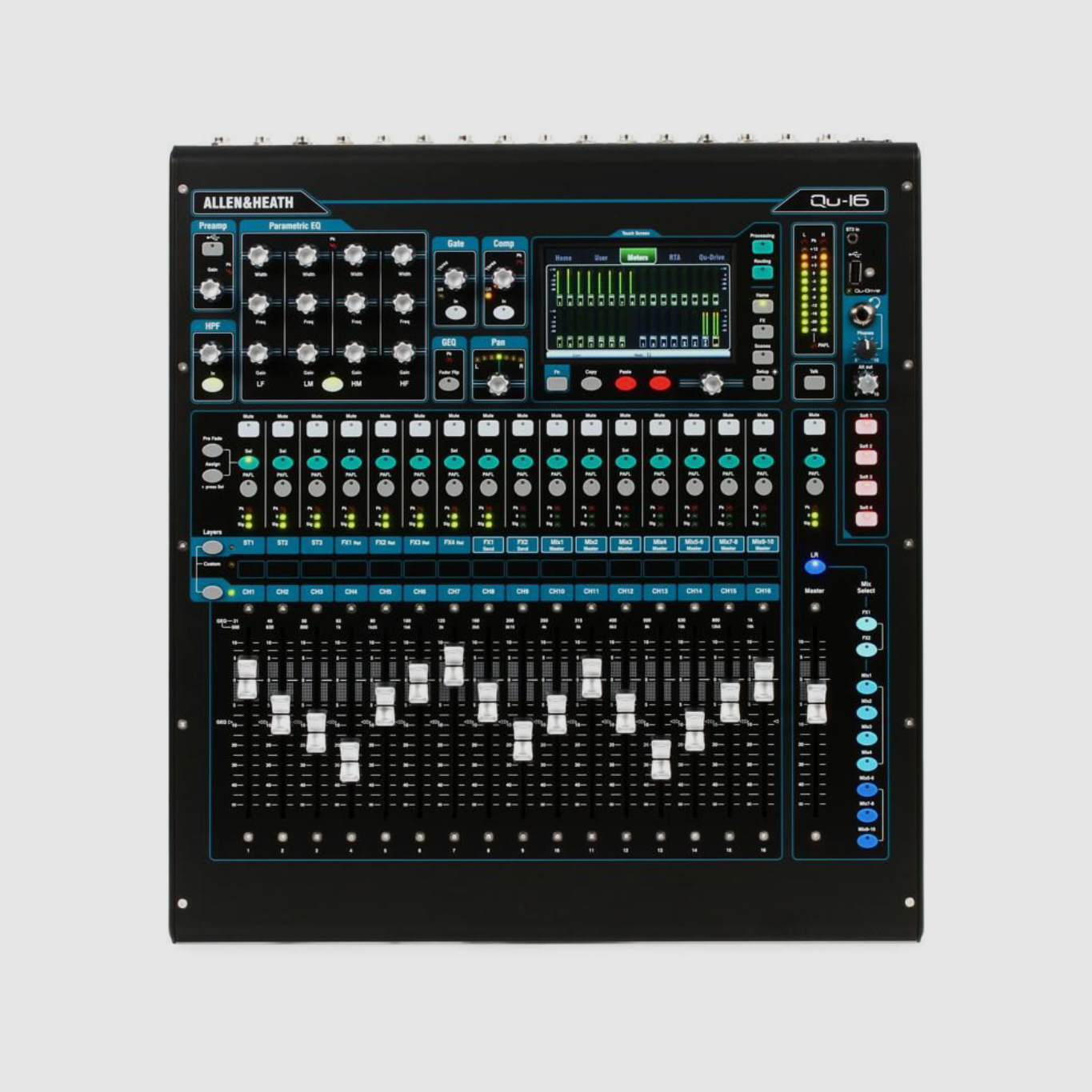 16 entradas mono via XLR ou jack com pré-amplificadores AnalogIQ 3 entradas estéreo via jack 4 retornos Stereo FX 16 Busses 12 saídas Mix: LR, Mono Mix 1-4, Stereo Mix 1-3 Saída digital AES 4 FX Engines com iLive FX Library 4 grupos mudos Fader do motor Trim, polaridade, corte baixo, porta, inserção, equalizador paramétrico de 4 bandas, compressor e Delay em todas as entradas Inserir, EQ paramétrico de 4 bandas, EQ gráfico, compressor e delay para as principais saídas LR e mix mono Qu-Drive: gravação / reprodução multipista direta de / para a unidade USB ou disco rígido Tela sensível ao toque 800 x 480 Gerador de sinal embutido Porta de Áudio Remota dSNAKE Streaming de áudio USB Compatível com o ME Personal Mixing System Controle MIDI DAW Dimensões: 440 x 500 x 186 mm Peso: 10 kg New firmware version 1.9: Pro Factory microphone presets from Audio-Technica, Sennheiser und Shure, DAW control for Windows, new QU-Control App