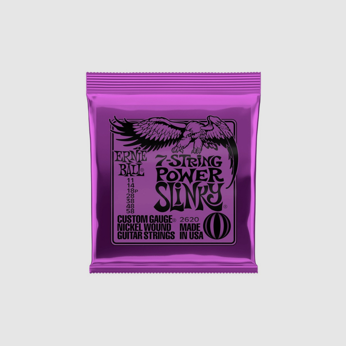 Cordas de guitarra elétrica Ernie Ball níquel são feitas de fio de aço niquelado enrolado em torno de fio de aço em forma de hex chapeados. As cordas lisas são feitas de aço carbono alto estanhado especialmente temperado produzindo um tom bem equilibrado para a guitarra. .011, .014, .018p, .028, .038, .048, .058