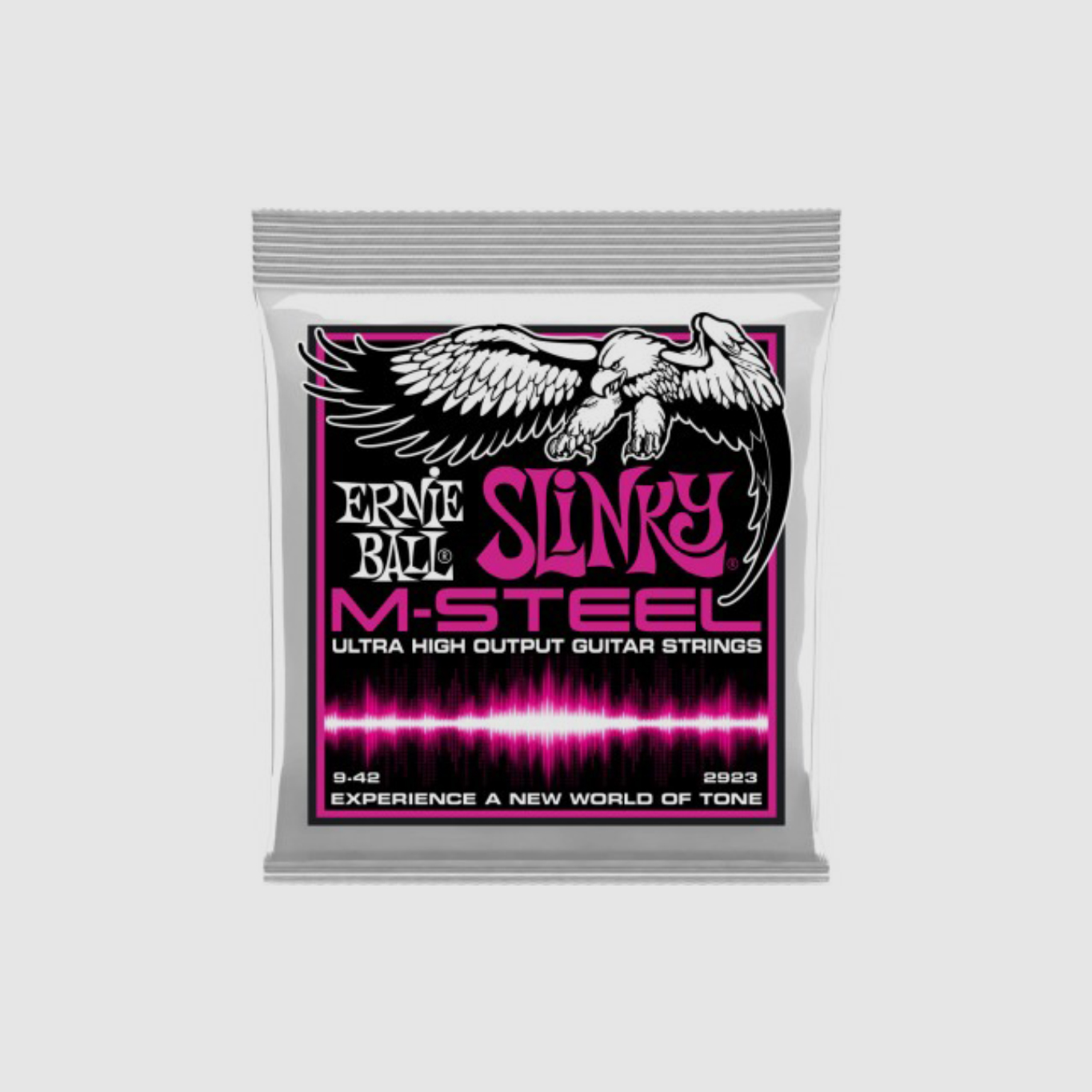 As cordas de guitarra elétrica Ernie Ball M-Steel são feitas de uma liga Super Cobalt patenteada enrolada em um fio hexagonal de aço Maraging, produzindo um tom mais rico e mais completo com uma poderosa resposta de baixo custo. As cordas de guitarra Elétrica M-Steel são compostas por um aço especialmente temperado para máxima resistência à fadiga. As cordas planas elétricas também utilizam um enrolamento patenteado de aço ao redor da extremidade da esfera, que reduz o deslizamento, a quebra e permanece melhor do que as cordas lisas convencionais. .09, .011, .016, .024w .032, .042