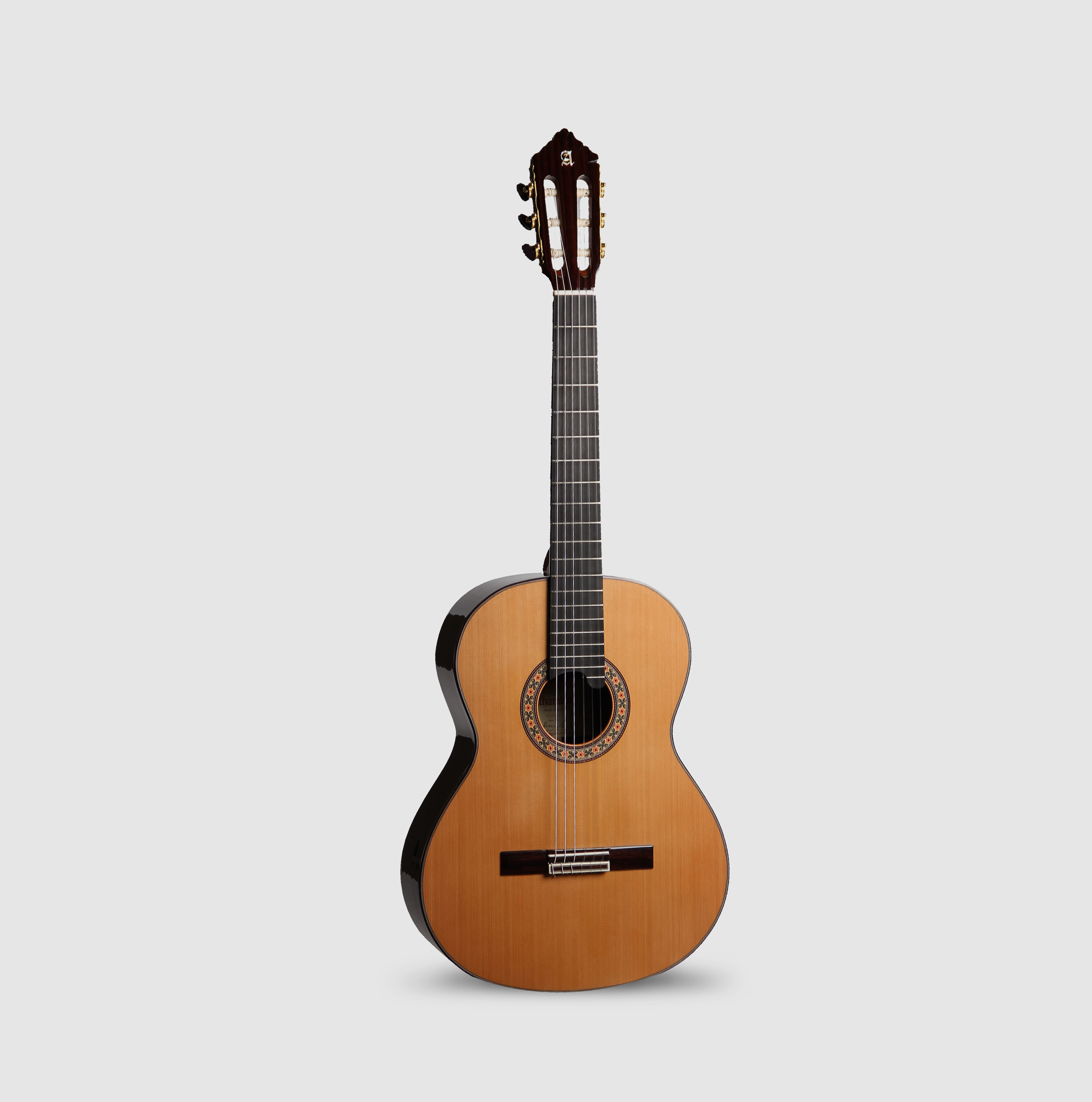 A guitarra clássica Alhambra 10P tem o tampo maciço em cedro ou abeto alemão, corpo em pau-santo da Índia maciço, escala em ébano, Braço em cedro. Estojo incluido.