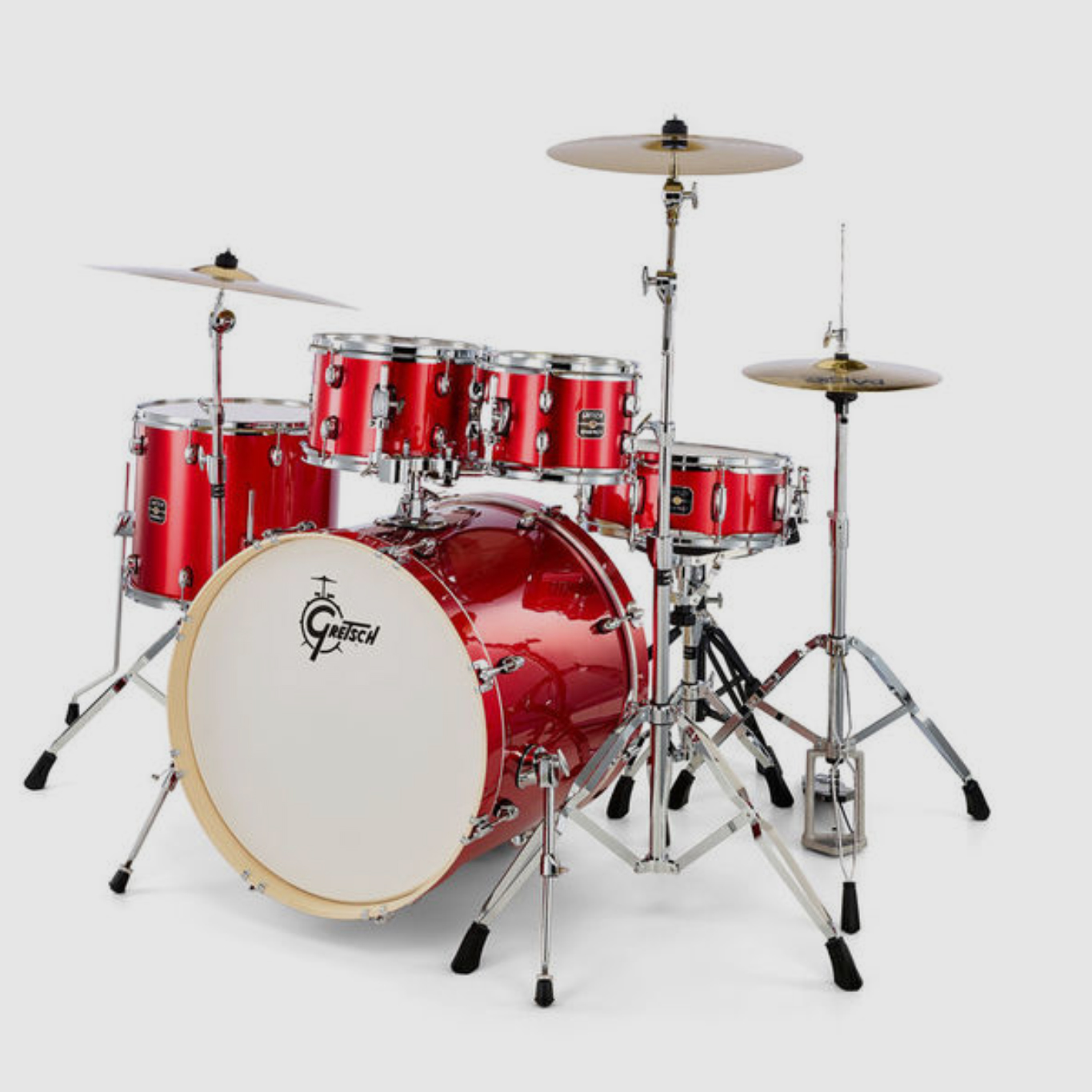 O kit Gretsch Energy Standard Red vem com todo o hardware necessário para iniciar o treino para ser baterista, incluindo um pedal de bombo, um suporte de hi-hat, um suporte de tarola e suporte de prato. Os kits de Energy também incluem um conjunto de pratos Paiste 101 de 3 peças que tem: Hi Hat, 13 ", Crash 16", Ride 20 ". Bombo de 22"x 18", tarola de 14"x 5.5", timbalões de 10"x 07" e de 12"x 08" e timbalão de chão de 16"x 16".