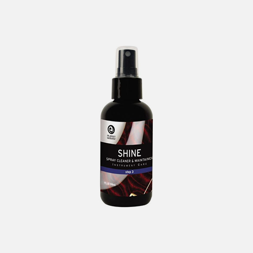 O novo spray de limpeza e manutenção SHINE da Planet Waves mantém o acabamento do instrumento como se fosse novo. O SHINE limpa a poeira, as marcas de dedos e as pequenas imperfeições, enquanto valoriza a beleza da cor original. Borrife uma pequena quantidade em uma flanela e espalhe por toda a superfície de seu instrumento com movimentos circulares. Repita este processo diariamente ou quando necessário.