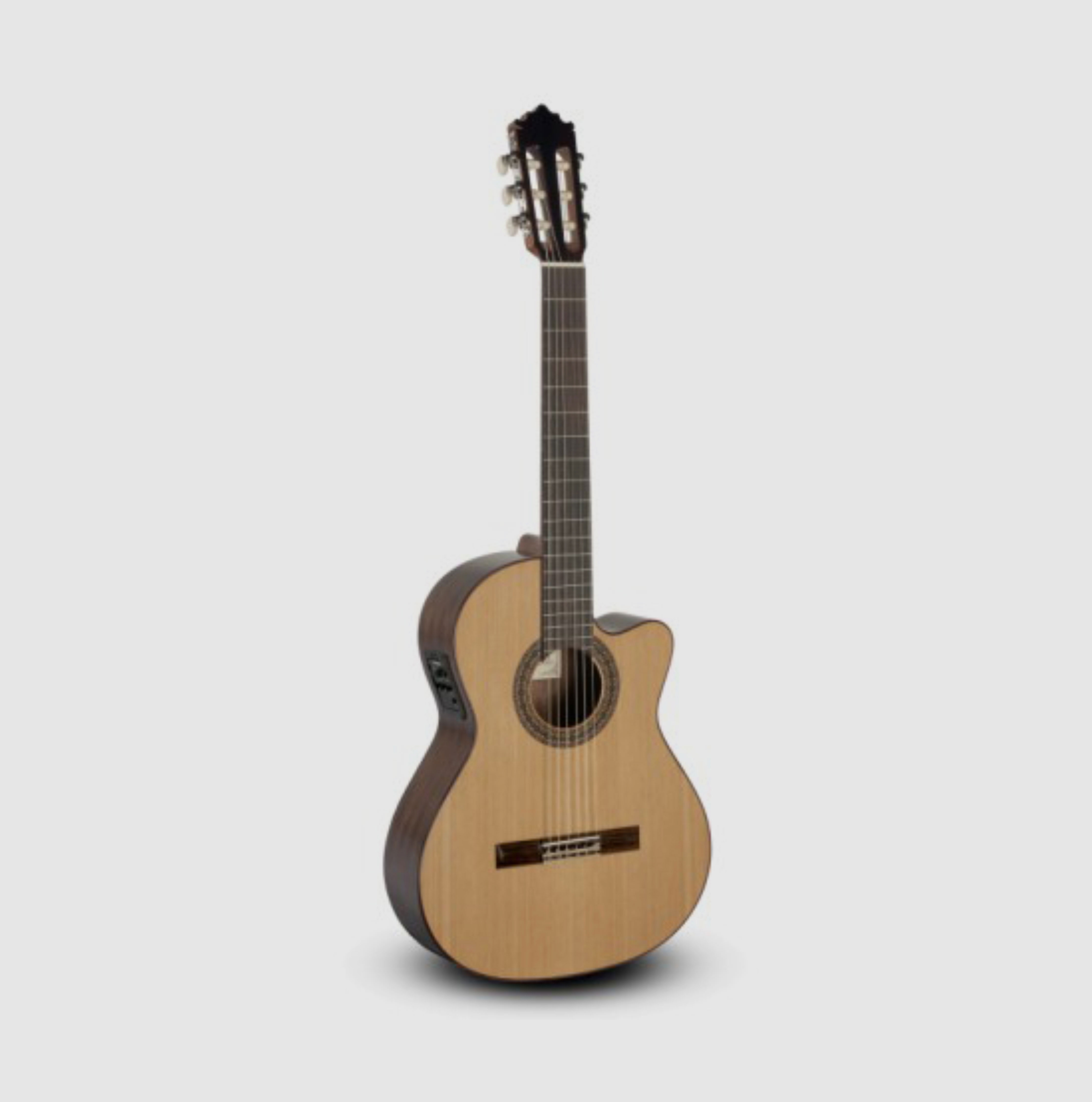 A guitarra Clássica eletrificada com cutaway Paco Castillo 222C tem o tampo em Cedro Canadiano Maciço, braço em mogno africano , ilharga e fundo em sapeli, escala em rosewood indiano e os perfis em pau santo indiano, carrilhões niquelados e pickup da Fishman Clássica III. A marca Paco Castillo é uma referência de qualidade.