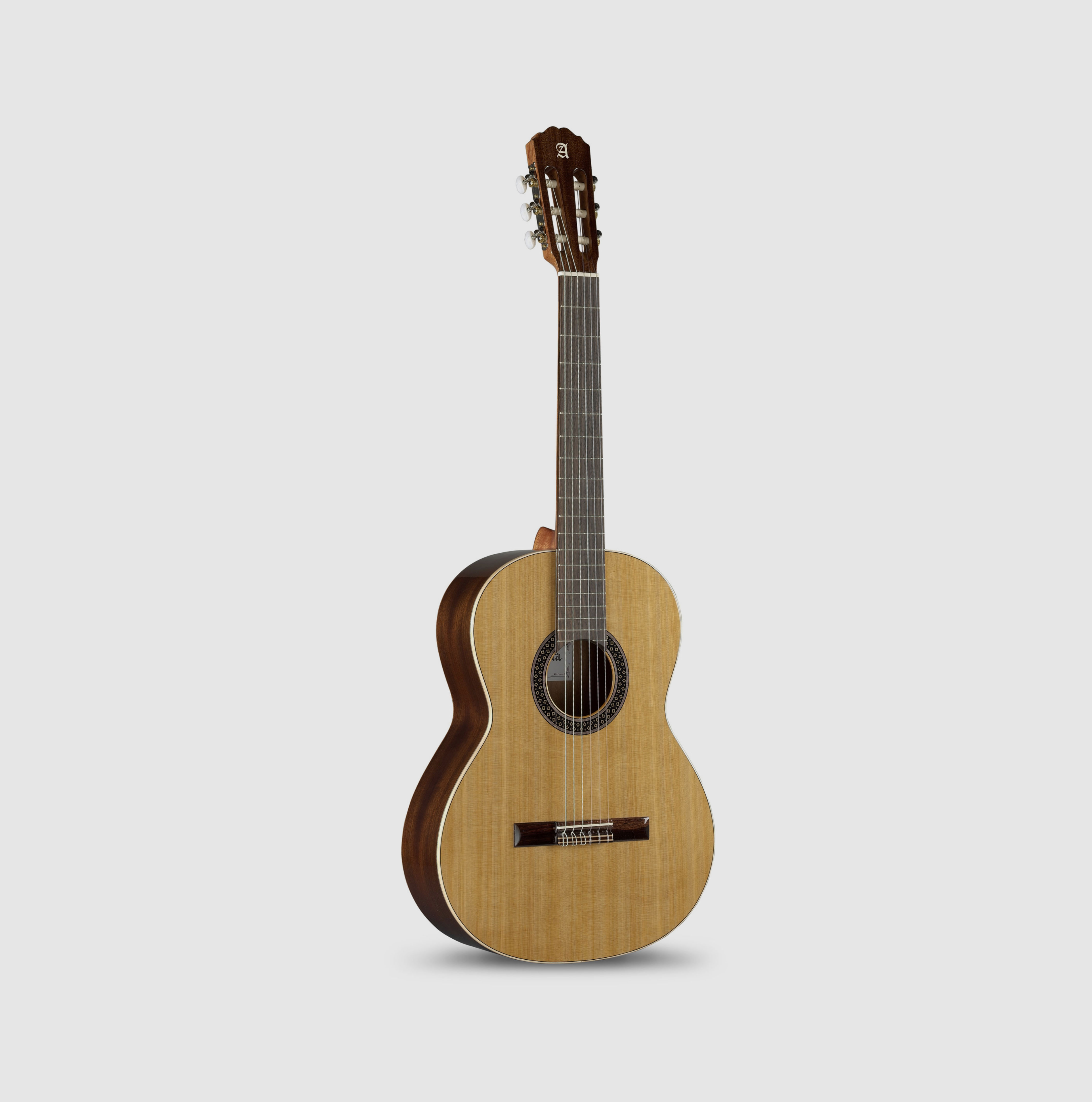 A guitarra clássica Alhambra 1C 3/4 Cadete tem o tampo maciço em cedro, escala em pau santo e ilhargas e fundo em sapeli.