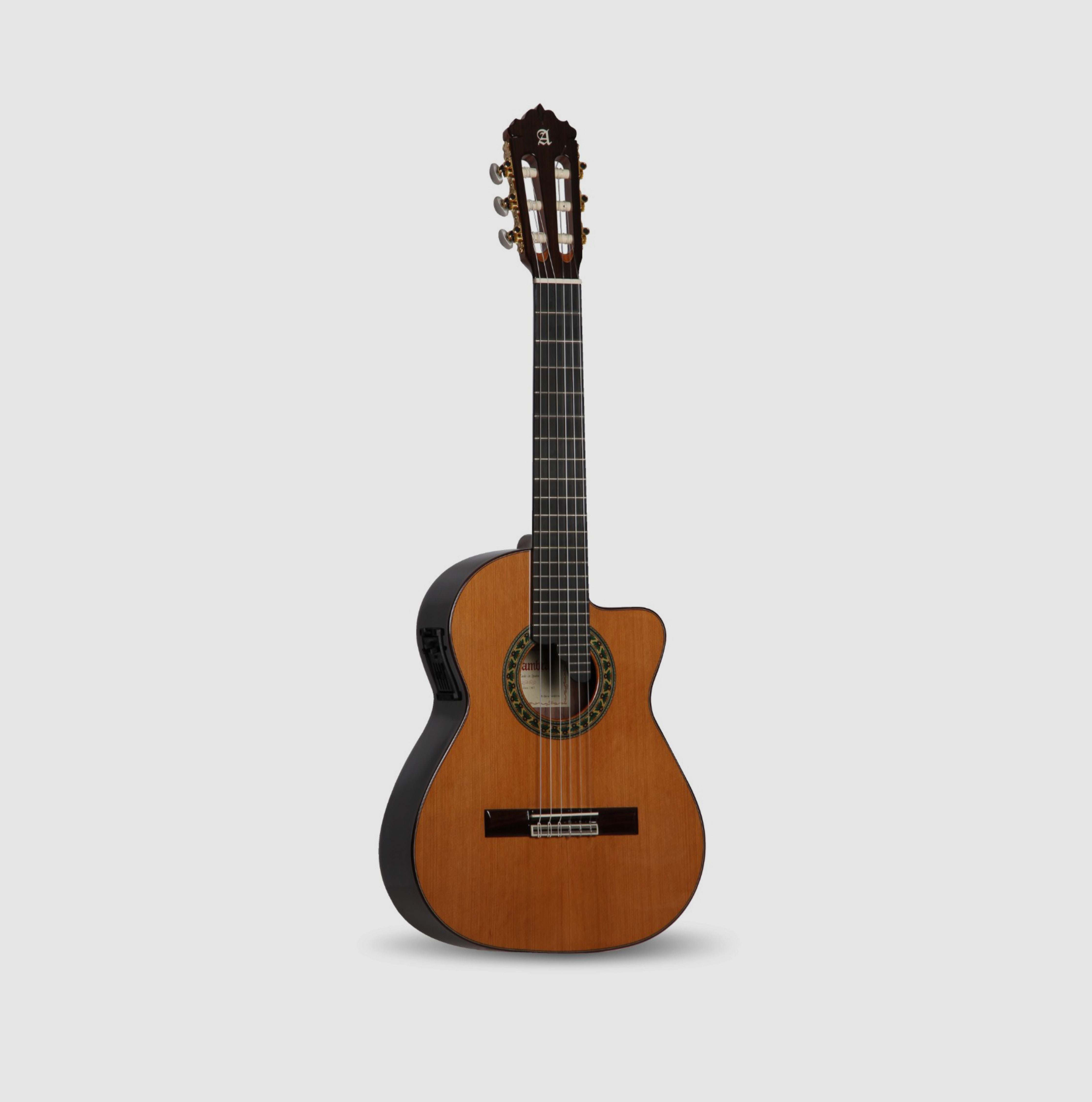 A guitarra clássica eletrificada com cutaway Alhambra 5PCW E2 tem o tampo maciço em cedro, corpo em pau-santo da Índia, escala em ébano, Braço reforçado com Ébano, pickup E2 Fishman Prefix ProBlend.