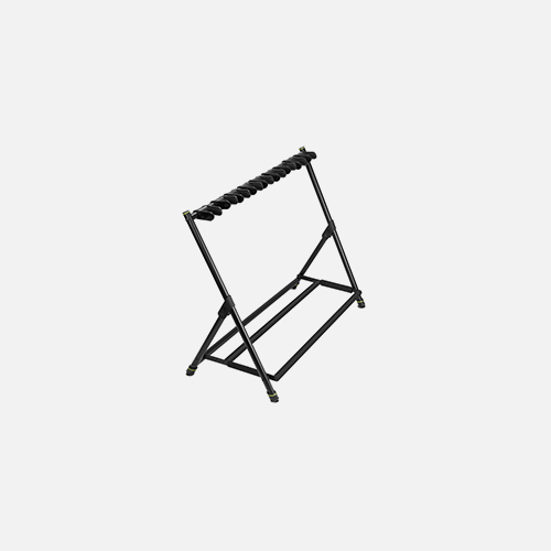 Rack de Guitarra para 7 Instrumentos Projetado para todas as guitarras acústicas, elétricas e baixo, os racks Gravity estão disponíveis em quatro versões, acomodando 3, 5, 7 ou 9 instrumentos. Eles são feitos de tubos de aço para serviços pesados com um acabamento de revestimento em pó preto. Segurando os pescoços com firmeza e segurança, as garras de toque suave ajustáveis são acolchoadas e destacáveis. Os trilhos que sustentam os corpos das guitarras são cobertos em espuma especificamente formulada para evitar amassados e arranhões. Rápido de configurar e economizando espaço, os suportes para guitarra Gravity dobram-se para facilitar o transporte e o armazenamento.