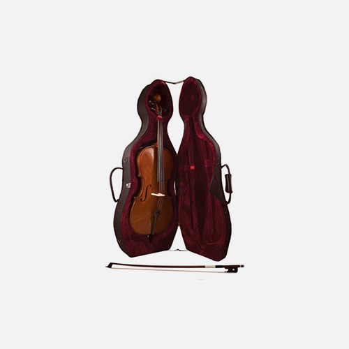 Violoncelo em madeira maciça, cordal com afinadores, escala e cravelhas em ébano, estojo semirigido e arco.