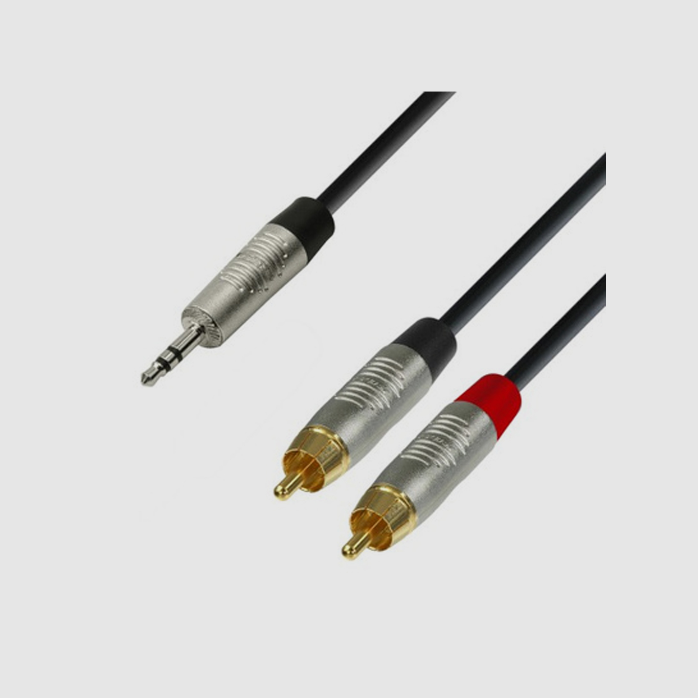 Cabo de áudio, equipado com um plugue jack estéreo de 3,5 mm e dois plugues cinch / RCA, banhados a ouro para transmissão ideal. Conecta players modernos, como MP3 players, ao DJ ou mixer ao vivo sem a necessidade de adaptadores adicionais.