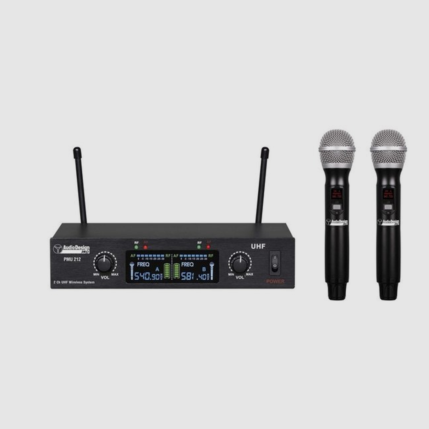 Sistema sem fios em banda UHF, duplo com 2 microfones de mão, frequência fixa entre 540.900 e 586.625, saída balanceada XLR e jack, disponível em 5 frequências diferentes, chassis do receptor em metal.
