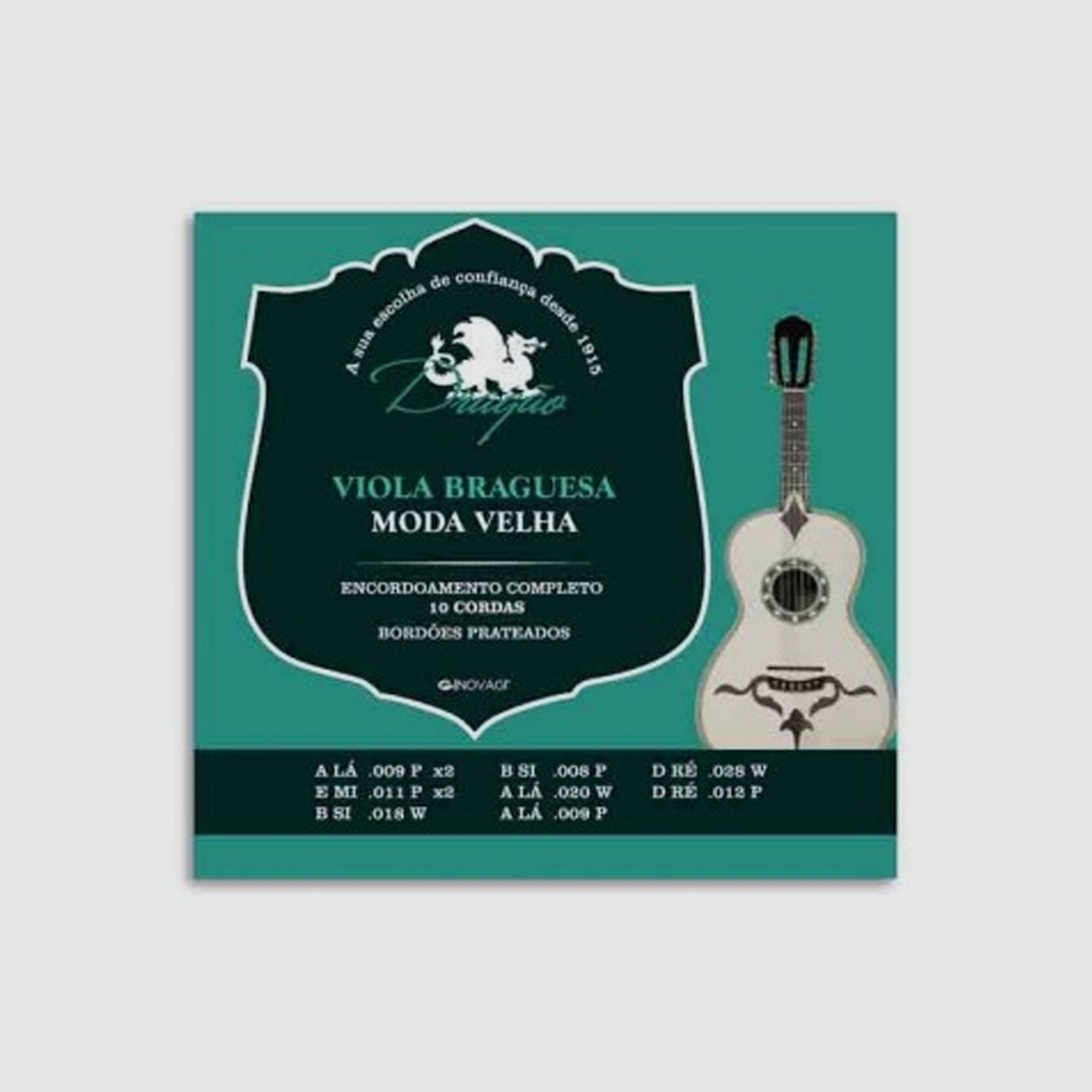 Jogo de cordas da Dragão para viola braguesa, na afinação moda velha. É um jogo completo que contém 10 cordas, com bordões prateados. A viola braguesa é um cordofone tradicional português, da região do Minho. É geralmente tocada em rasgado, com os dedos a percorrer as cordas.