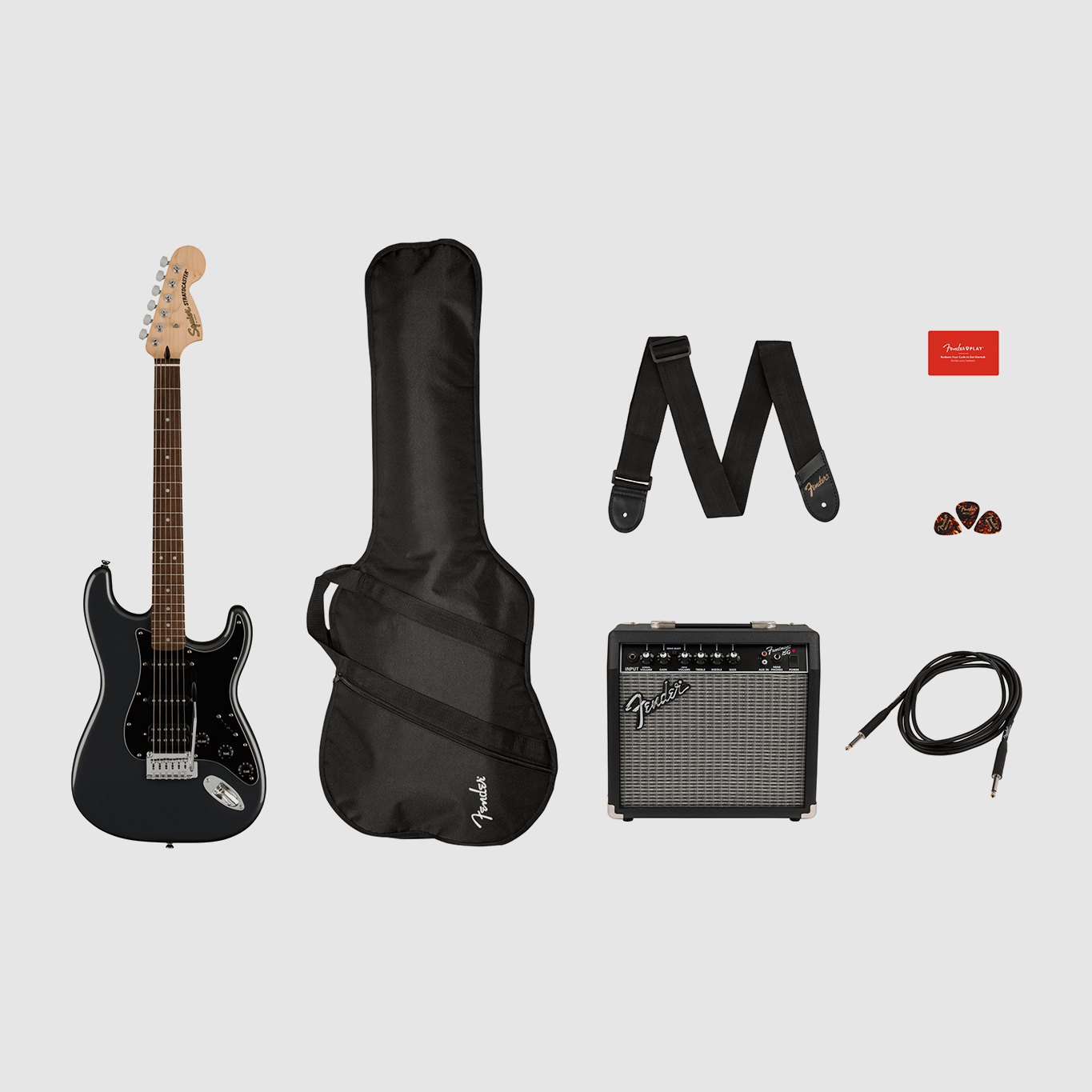 Fornecendo 15 watts de tom Fender puro, o amplificador Frontman 15G possui canais limpos e overdrive, EQ de três bandas, fone de ouvido para prática silenciosa e uma entrada auxiliar para conectar um dispositivo de mídia. Com a bolsa acolchoada, palhetas, alça e cabo de 10 pés incluídos, o Squier Affinity Stratocaster HSS Pack tem tudo o que você precisa para transformar sua afinidade com a música em uma paixão ao longo da vida