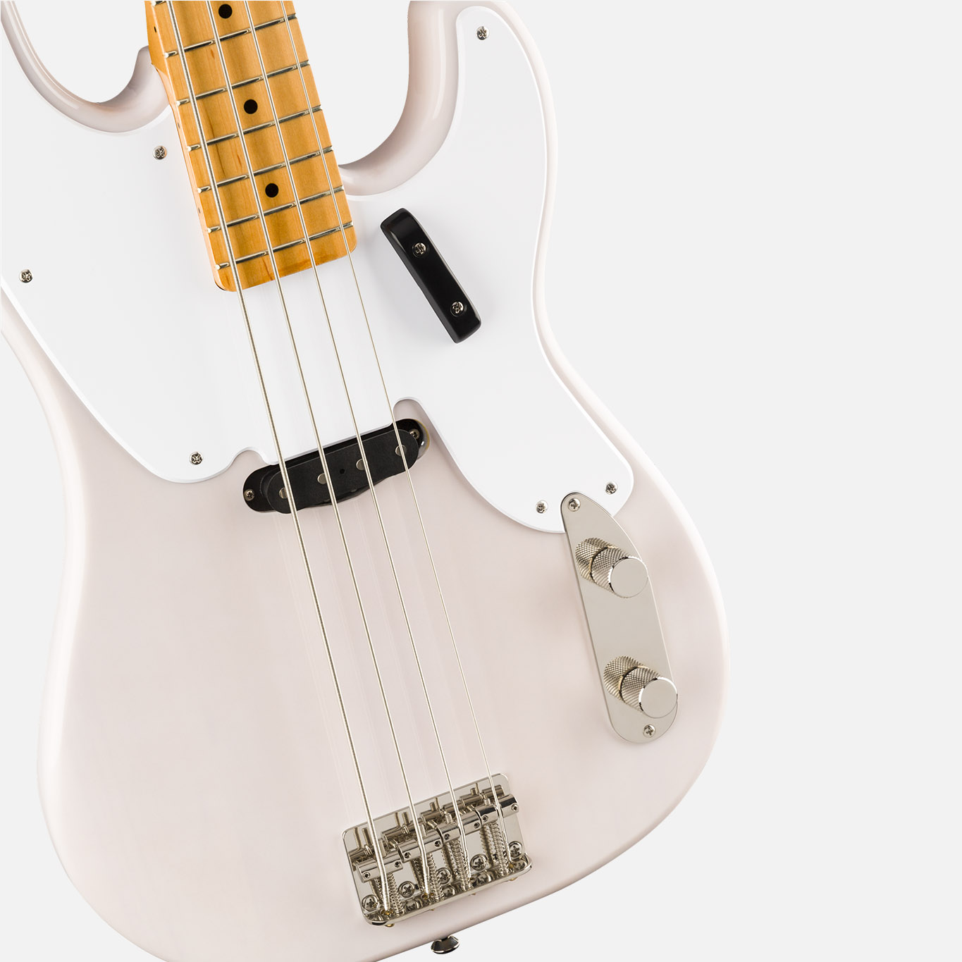 O baixo Fender SQ CV 50s P Bass MN WHB possui um corpo: Pinho Braço: Maple Braço aparafusado no corpo Escala: Maple Embutidos: Pontos pretos Perfil do braço: C 20 Trastes Narrow tall Largura do pente: 43 mm Comprimento da escala: 864 mm Raio da escala: 241 mm Pente: Osso Pickups: 1 single coil Fender-designed alnico (meio) Botões: 1 botão de volume e 1 botão de controlo de timbre Pickguard de uma camada Ponte: Vintage-style de 4 selas Hardware: Níquel Afinadores: Vintage-style Cordas: Fender USA Bass 7250M .045 - .105 Cor: White Blonde