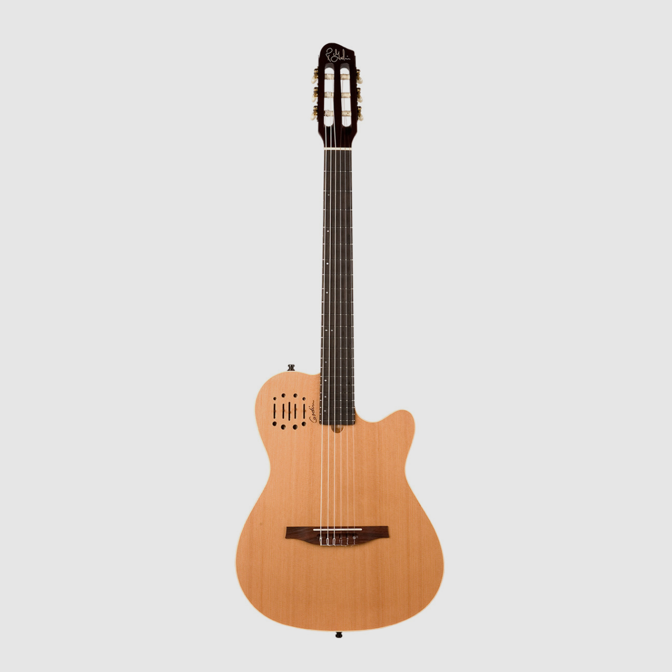 O Multiac Encore é equipado com componentes eletrônicos personalizados da EPM. Este sistema de fonte dupla combinável e fácil de usar apresenta um transdutor de sub-sondas, bem como um transdutor de placa de som acústica; ambos podem ser facilmente combinados entre si. Esta guitarra é ideal para jogadores que procuram um incrível som de cordas de nylon amplificado em configurações de banda ao vivo e alta sem praticamente nenhum feedback. O Multiac Encore também possui uma escala de 25 ½ ”e uma confortável largura de porca, facilitando a transição dos tocadores de cordas de aço para as cordas de nylon. Este modelo apresenta um corpo de bordo em folha de prata com câmara com tampo de cedro sólido, além de um pré-amplificador de fonte dupla com controles deslizantes de volume, agudo, médio, baixo e baixo.