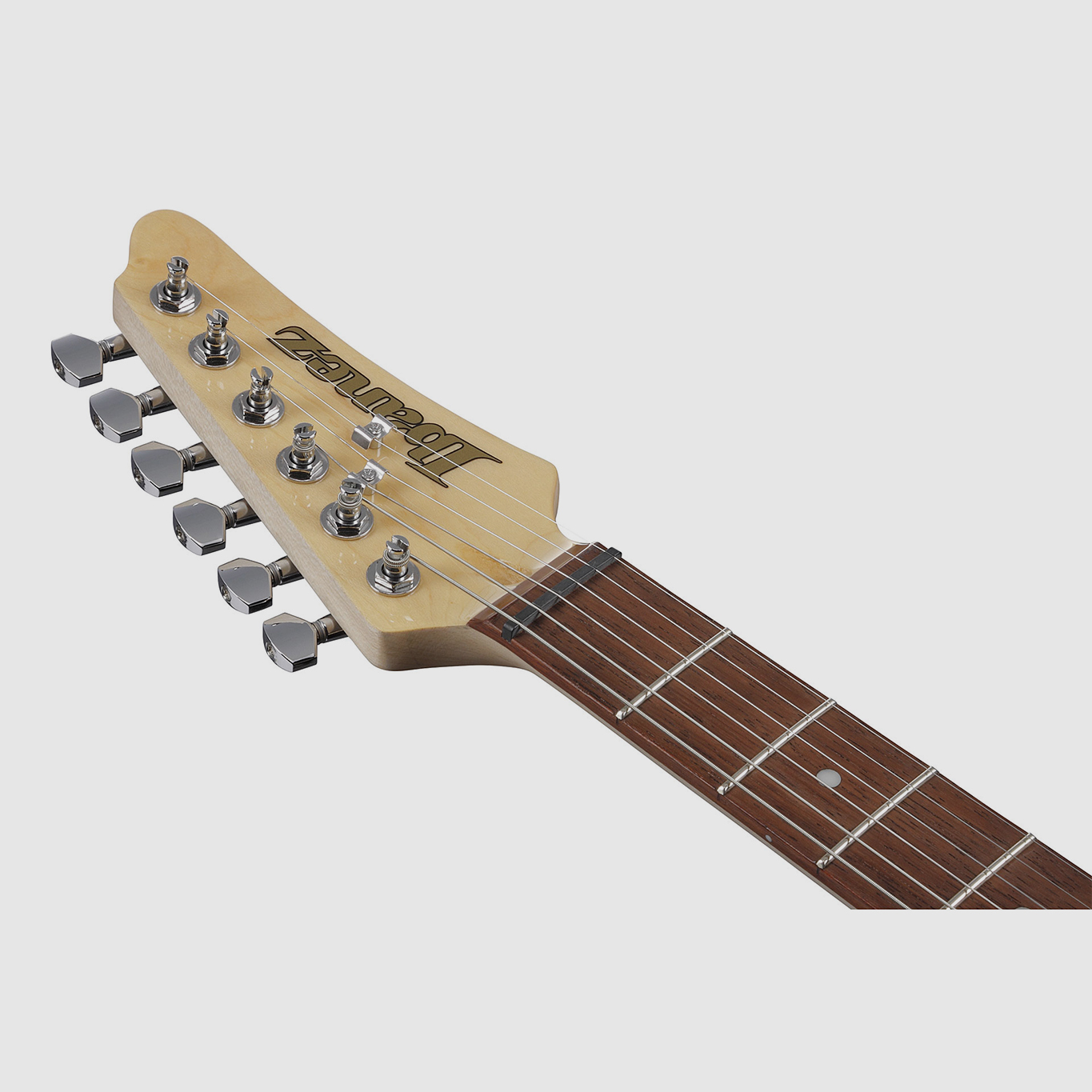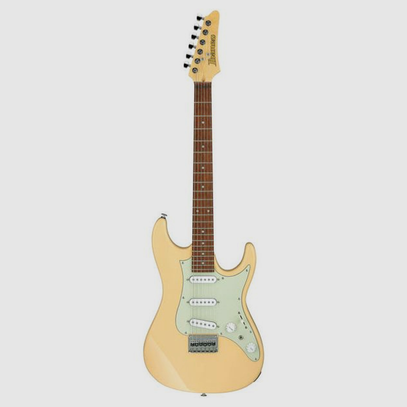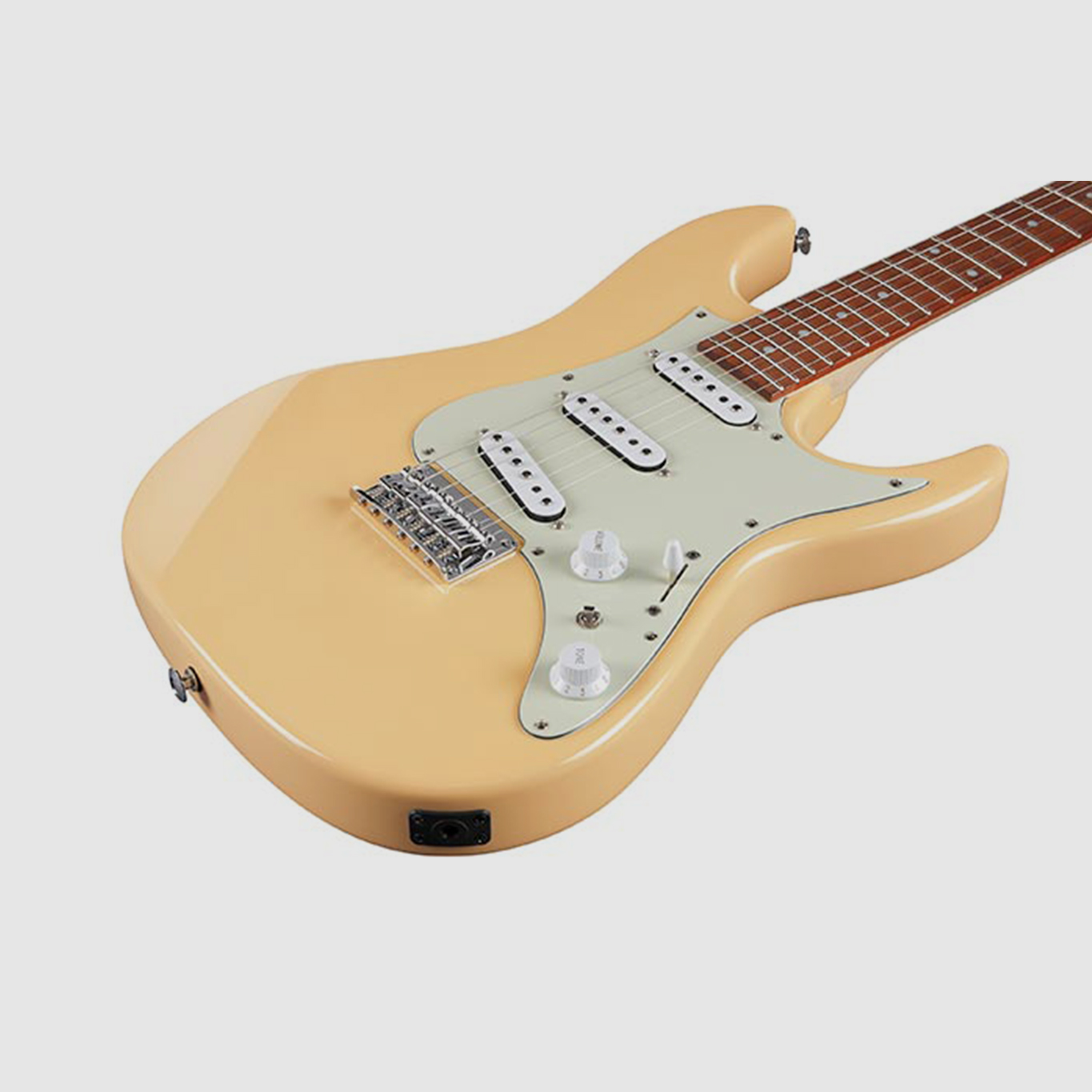 Ibanez AZES31-IV; az guitarra elétrica; az séries essenciais; corpo: álamo; pescoço: bordo; escala: jatobá; montagem no pescoço: aparafusada; forma do pescoço: azes; embutidos: pontos brancos; 22 trastes médios; porca: plástico; largura da porca: 42 mm (1,65"); escala: 635 mm (25"); raio do fingerbard: 250 mm (9,84"); espessura no 1º traste: 21 mm (0,81"); espessura no 12º traste: 23 mm (0,89"); pickguard: hortelã; captadores: essentials single-coil (ponte), essentials single-coil (meio), essentials single-coil (braço); controles: volume, tom, Sistema dyna-MIX8 com alter switch; switch: 5 vias; ponte: F106; acabamento do hardware: cromado; afinadores: Ibanez; cor: marfim; cordas de estoque: 0,010 - 0,046