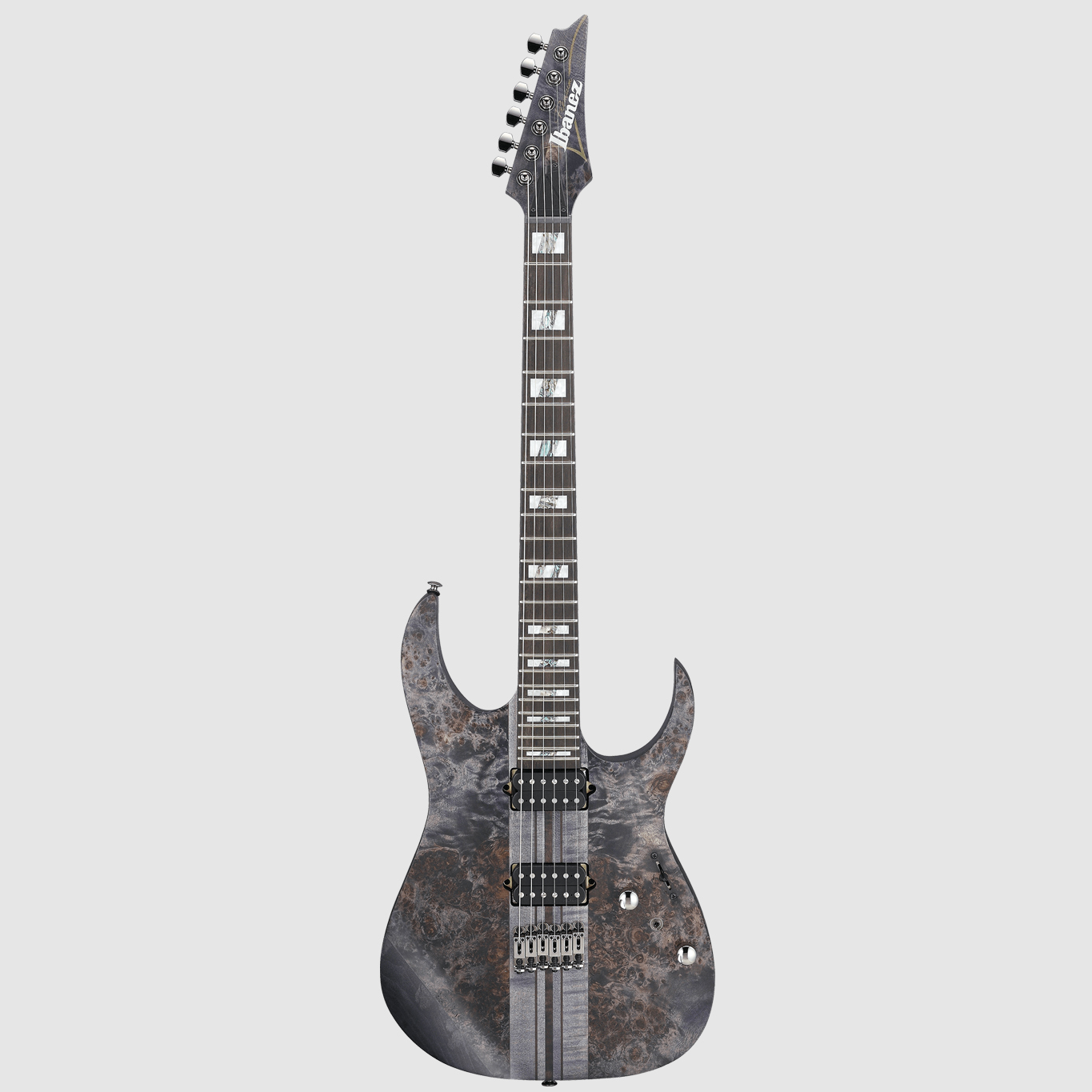 Ibanez RGT1221PB-DTF; RG guitarra elétrica; série premium; corpo: basswood; topo: álamo; pescoço: 7 peças. bordo/nogueira; escala: ébano (diospyros crassiflora); montagem no pescoço: pescoço através do corpo; forma do pescoço: feiticeiro III; inlays: bloco de acrílico e abalone; 24 trastes jumbo de aço inoxidável; porca: plástico; largura da porca: 43 mm (1,69"); escala: 648 mm (25,51"); raio do fingerbard: 400 mm (15,75"); espessura no 1º traste: 19 mm (0,75"); espessura no 12º traste: 21 mm (0,83"); captadores: DiMarzio The Tone Zone humbucker (ponte), DiMarzio Air Norton humbucker (braço); controles: volume, tom, sistema de comutação dyna-MIX10; interruptor: 5 vias ; ponte: monotrilho; acabamento de hardware: preto cosmo; tarraxas: Gotoh MG-T travamento; incl. gigbag; cor: crepúsculo plano profundo; cordas de estoque: Daddario EXL110 .010 - .046