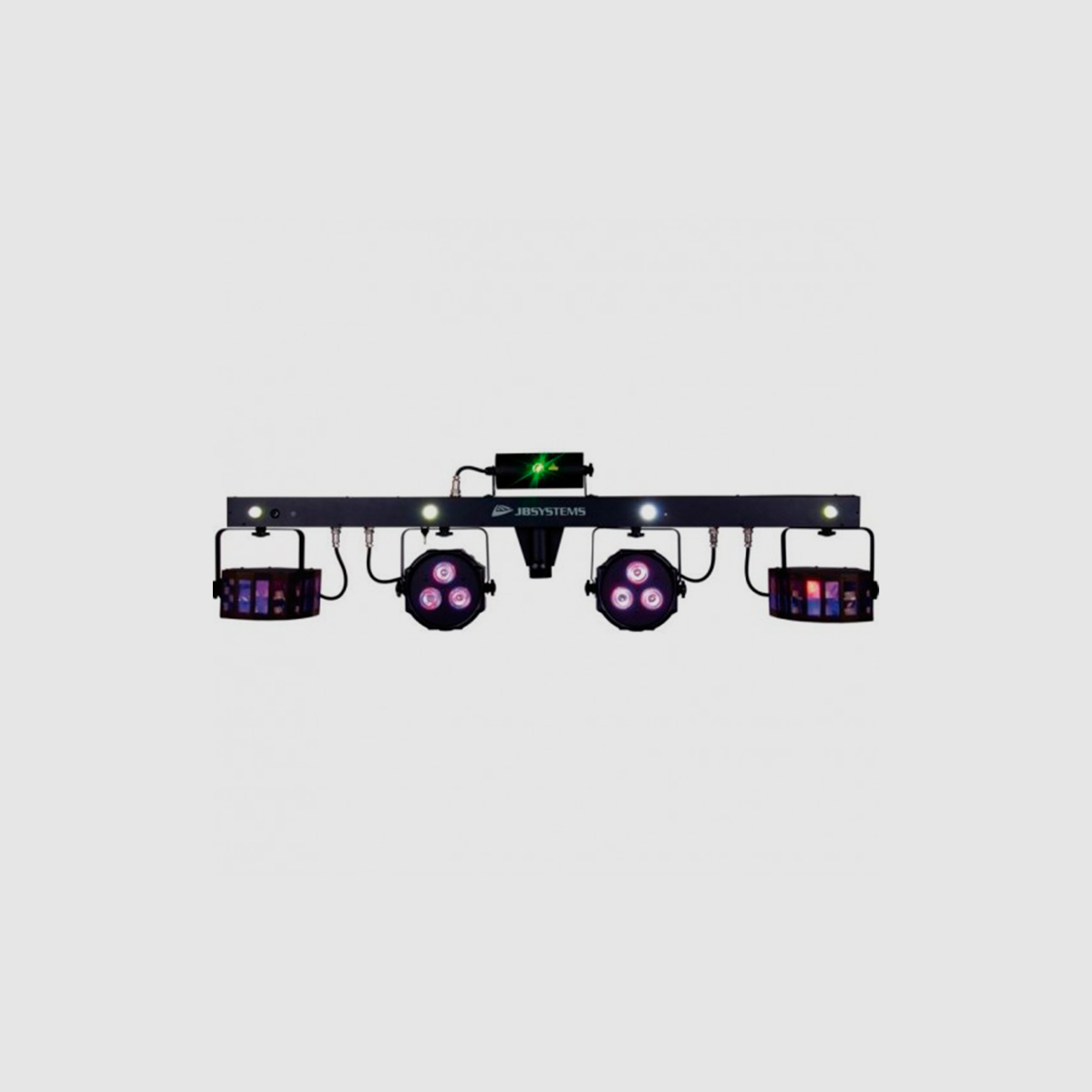 Barra Alimentada c/ 4 Efeitos: 2 Projetores RGB (3x9W) + 2 LED Derby RGB (3x3W) + 4 LED Strobe + Laser Verde e Vermelho. Modos Auto/Som/DMX. Comando sem fio incluído. Saco incluído.