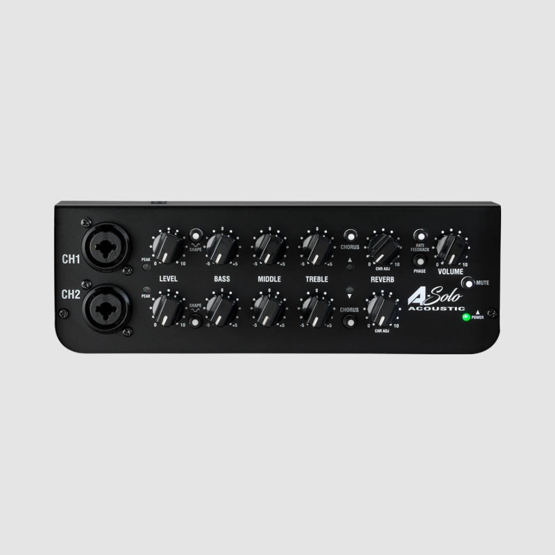 O A-Solo é um amplificador de guitarra acústica profissional, compacto e portátil, dedicado a proporcionar um som de guitarra acústica amplificado limpo e claro onde quer que precise. Seja no estúdio ou ao vivo no palco, o A-Solo cumpre sempre. O A-Solo tem duas faixas de canal completamente independentes. É suficientemente flexível para permitir a ligação de um microfone e um instrumento, dois instrumentos acústicos diferentes ou mesmo uma mistura de ligações separadas de microfone e captador do mesmo instrumento. Da mesma forma, em casa ou nos maiores palcos do mundo, o A-Solo pode ser a sua principal fonte de som num palco intimista ou o seu monitor pessoal em palcos maiores. O A-Solo está equipado com funcionalidades profissionais para grandes palcos, tais como eliminação de feedback e uma saída DI profissional.