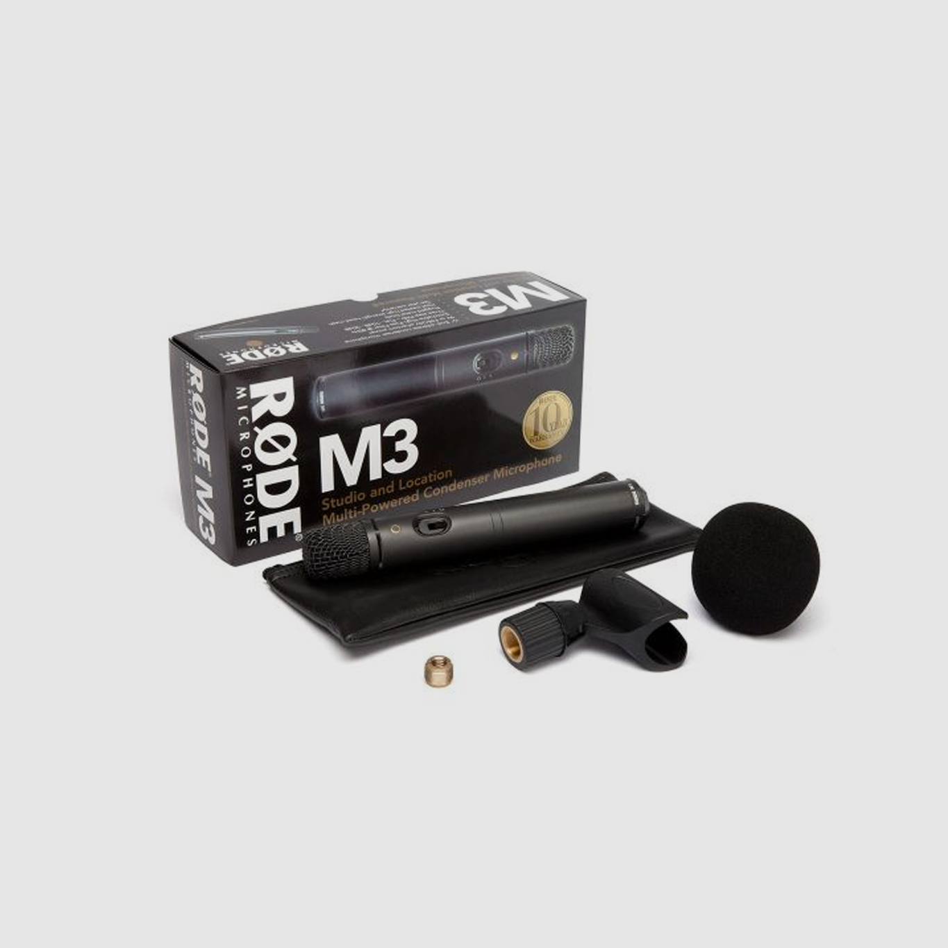 Rode M3 Microfone condensador cardióide com corpo construído em metal robusto Muito baixo ruído próprio (21 dB) Suspensão interna Um filtro passa-alto seleccionável através do botão de três posições Um atenuador interno de três níveis Possibilidade de ser alimentado por Phantom Power (+48V ou +24V) ou por pilha de 9V. Vem fornecido com bola protectora de espuma, cachimbo adaptador de tripé e bolsa de transporte em pele sintética
