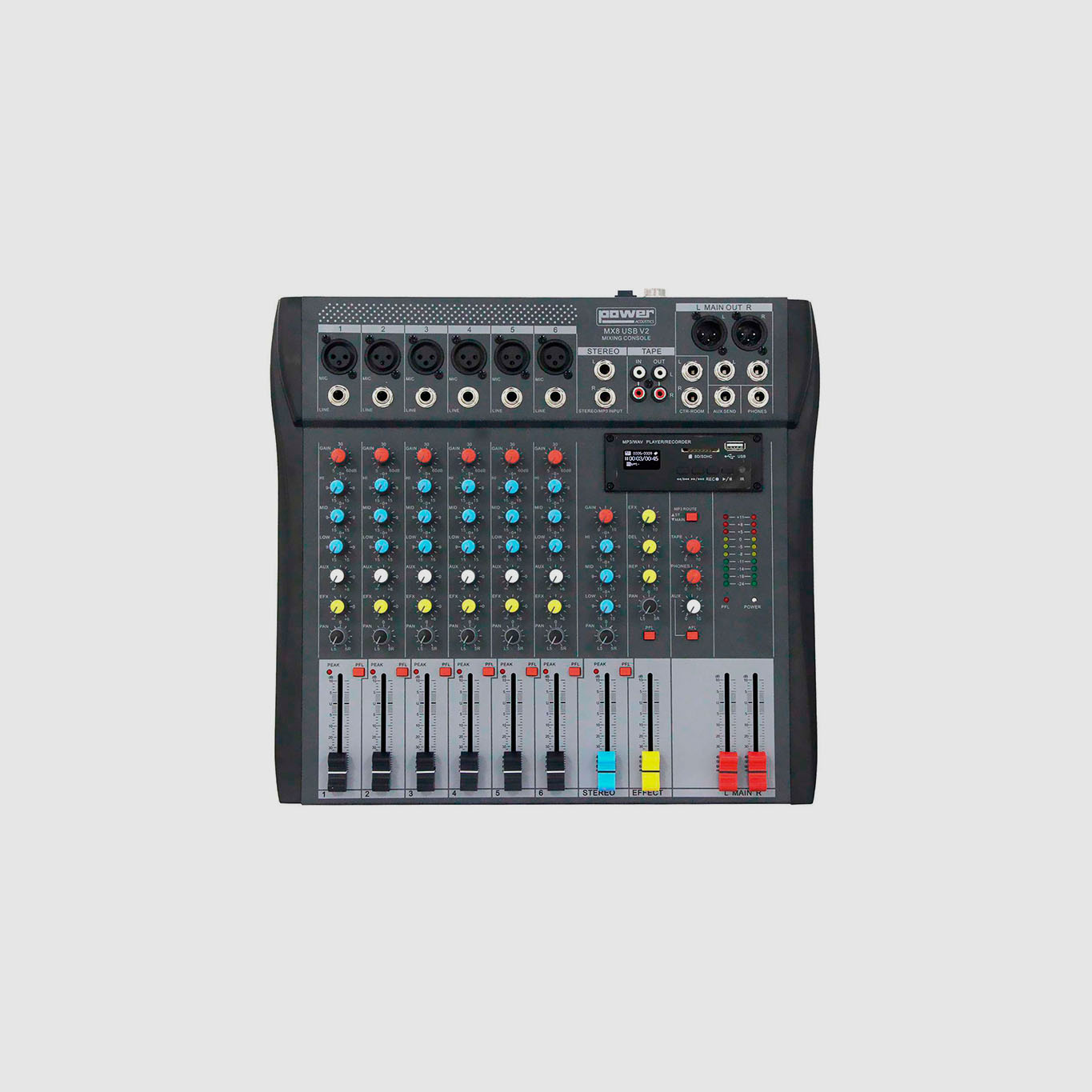 A Power Acoustics apresenta a nova geração do MX USB V2, agora integrando um player multimídia muito completo com a função de gravação. Feito com componentes de alta qualidade, esta série de consoles de mixagem possui pré-amplificadores de microfone com ruído ultra baixo. Para as entradas de microfone / linha, um equalizador de 3 bandas está presente. A gama é composta por quatro modelos: 8, 10, 14 e 18 entradas, adequadas para todos os tipos de ocasiões. Design ultraleve, ultrafino e fácil de transportar para desempenho móvel, o MX USB V2 satisfará até os usuários mais exigentes.