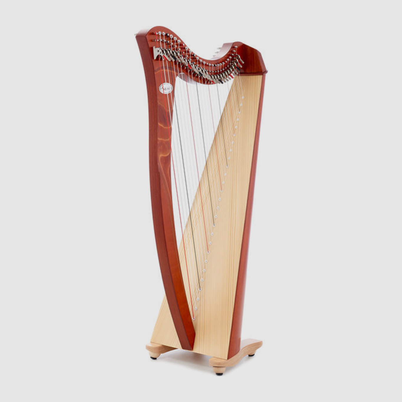 27 cordas Com cordões de seda Altura: 97,5 cm Largura: 54 cm Peso: 6,5 kg Varia da 1ª oitava A a 5ª oitava C (a '' '- C) Cor: cereja 4 pés (20 cm), bolsa e chave de afinação incluídas