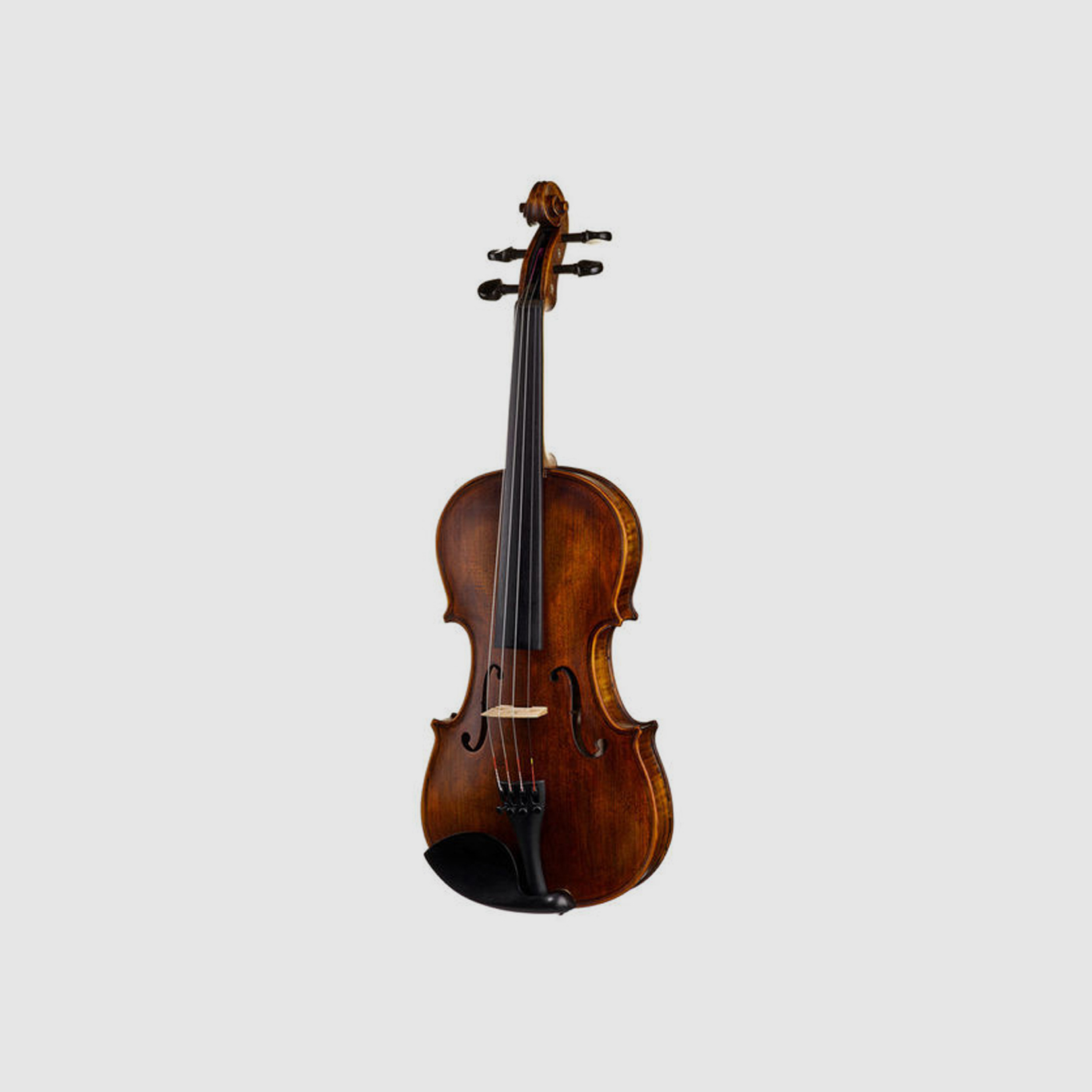 Violino com tampo em madeira de abeto seleccionada, fundo e aros em madeira de Ácer raiada, escala, cravelhas, queixeira e botão em ébano, acabamento antigo, estandarte Wittner Ultra com afinadores, cavalete Aubert, estojo rectangular com bolsa para partituras, arco com noz em ébano e montado em prata, resina, instrumento calibrado.